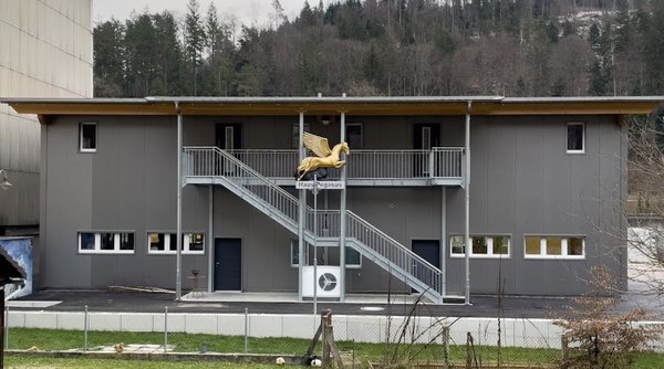 In Liesberg Station, im Industriegebiet einer ehemaligen Zementfabrik, befindet sich die 2023 neu erstellte, moderne, zweistöckige Liegenschaft.