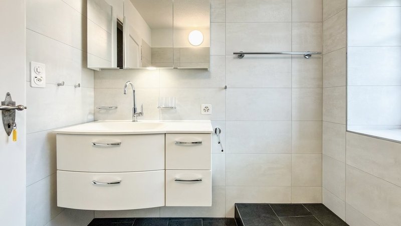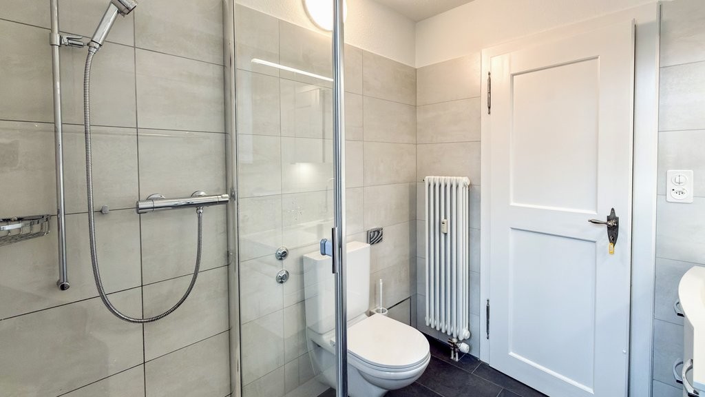Saniertes Badezimmer: Mit Stehdusche, WC, Lavabo und Fenster. Es verbindet Funktionalität mit einem gepflegten, modernen Ambiente.