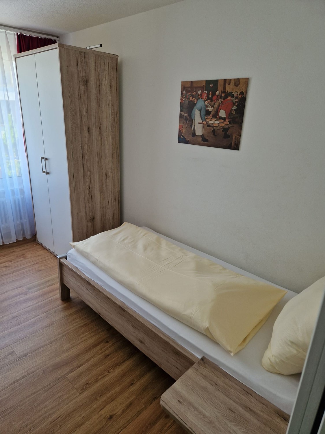 Schön möblierte Einzel oder Doppelzimmer mit 1 oder 2 Betten 90 x 200 cm, Bettinhalt, Kleiderschrank, Kleiderbügel, Tisch und 1-2 Stühle, Tag- und Nachtvorhang, grosser Spiegel, Beleuchtung, Abfallkorb, Kühlschrank, Rauchmelder
