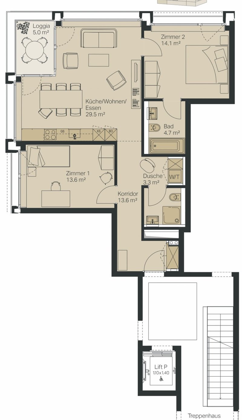 Die Wohnung ist möbiliert und die Küche ist voll ausgestattet. Es hat einen eigenen Waschturm in der Wohnung. Ausserdem gibt es einen gemütlichen Balkon.