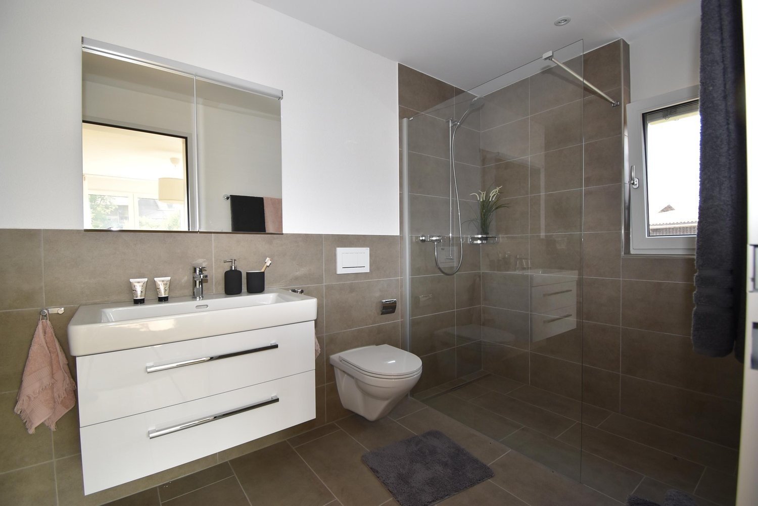 Badezimmer mit Dusche, Lavabo und Toilette