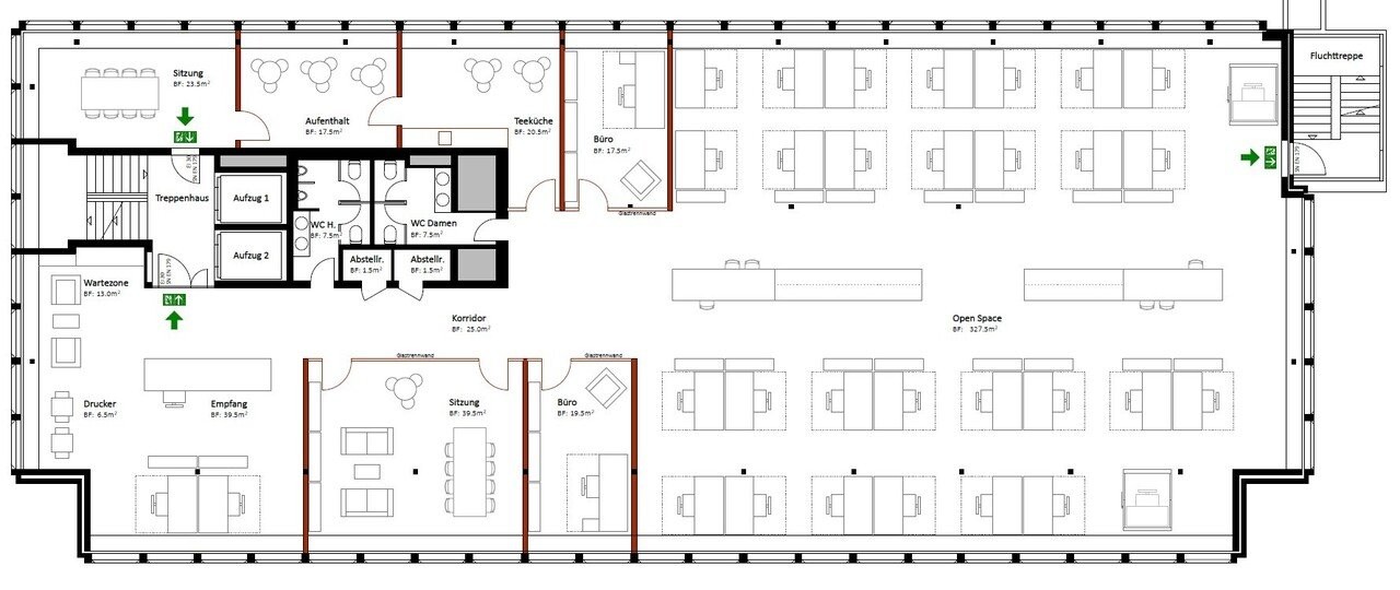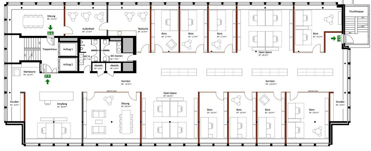 Raumstruktur: Open Space (netto CHF 500/m² p.a.) oder Klein- und Einzelbüros (netto CHF 520/m² p.a.) - gemäss Planunterlagen