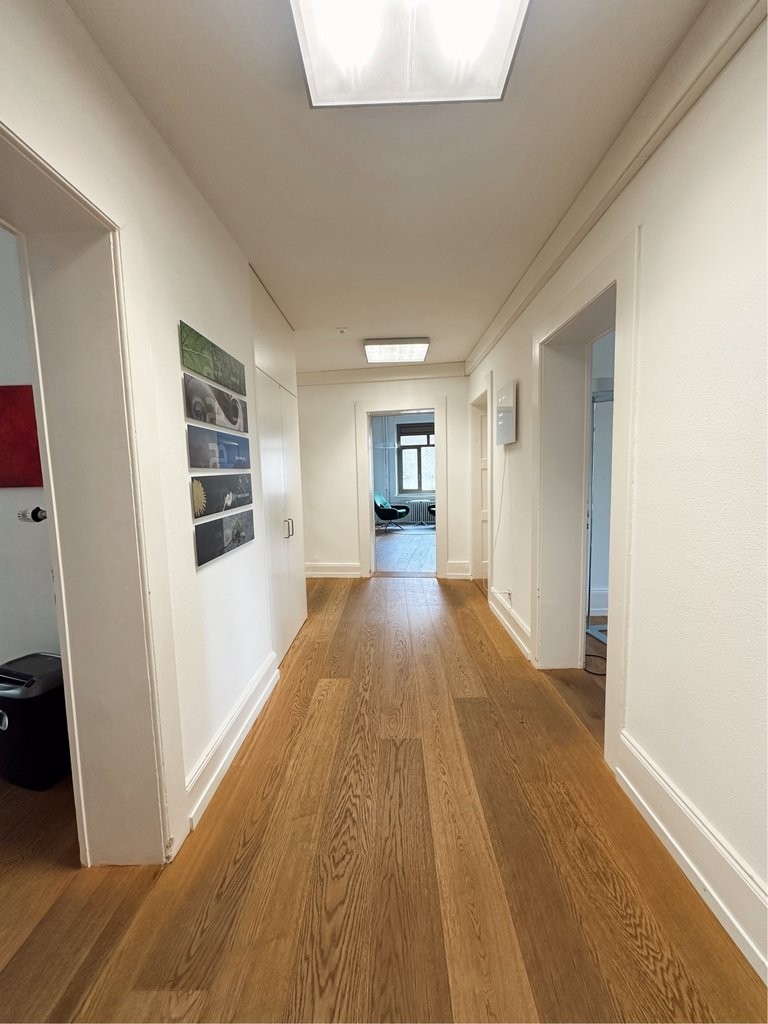 Die Bürofläche besticht durch ihre hellen und grosszügig geschnittenen Räume, die mit edlen Parkettböden ausgestattet sind. Die verschiedenen Ausrichtungen der Räume sorgen für eine angenehme Lichtstimmung und verleihen jedem Bereich seinen eigenen Charme. Einige Büros verfügen über direkten Zugang zu Balkonen, die zusätzlichen Freiraum schaffen.