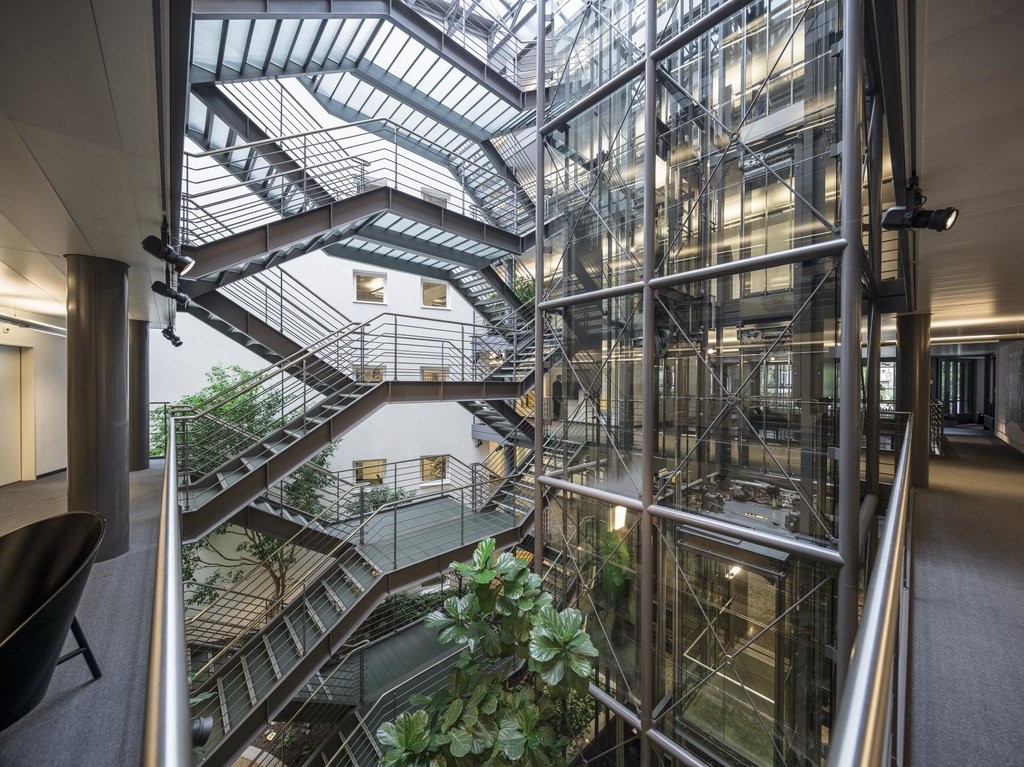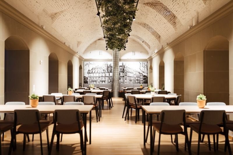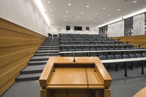 Im Auditorium befinden sich 112 fest eingebaute Sitzplätze mit Schreibfläche. Im hinteren Teil des Raumes ist Platz für ca. 20 weitere Stühle. Es besteht zudem die Möglichkeit, die Veranstaltung im Foyer über Lautsprecher mitzuhören. So können im weiteren Fall 30 Plätze zur Verfügung gestellt werden (für längere Veranstaltungen nicht zu empfehlen!). Neben dem Rednerpult steht ein Konferenztisch mit 6 Stühlen, der sich sehr gut für Podiumsgespräche eignet.