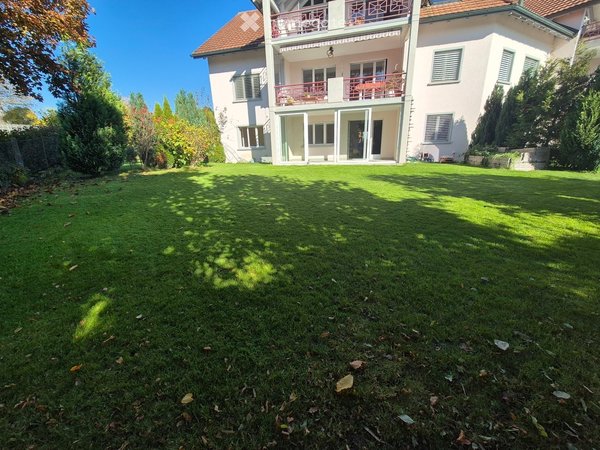 EG-Wohnung mit 110 m² Garten und verglastem Sitzplatz. Optional: 2 Tiefgaragenplätze, 1 Aussenparkplatz sowie Hobbyraum: