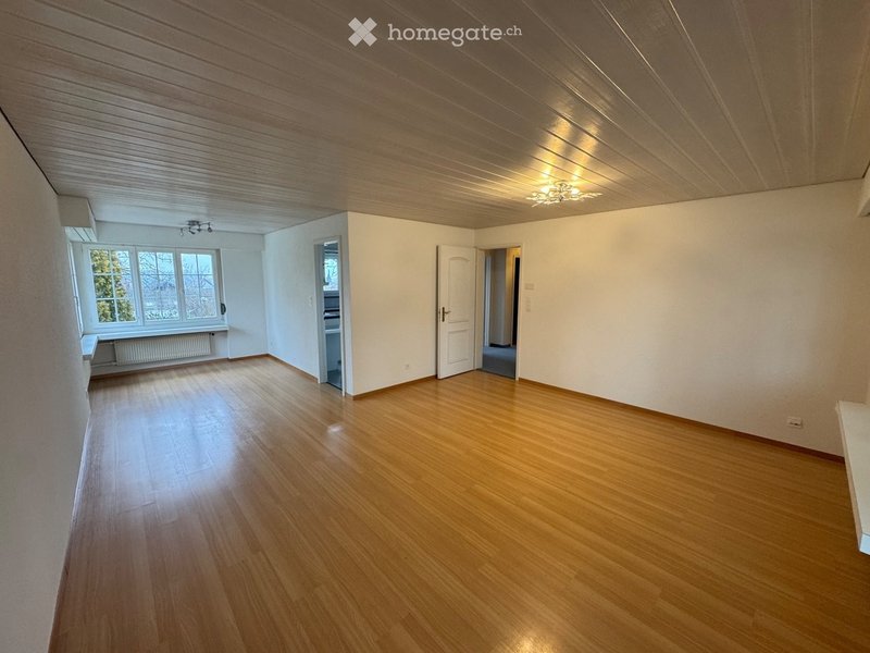 Über eine grosse Treppe gelangen Sie vom Eingangsbereich her in den oberen Bereich des Hauses. Hier befinden sich drei weitere Zimmer sowie ein grosszügiger Wohn-/ Essbereich mit angrenzender, funktionaler Küche.