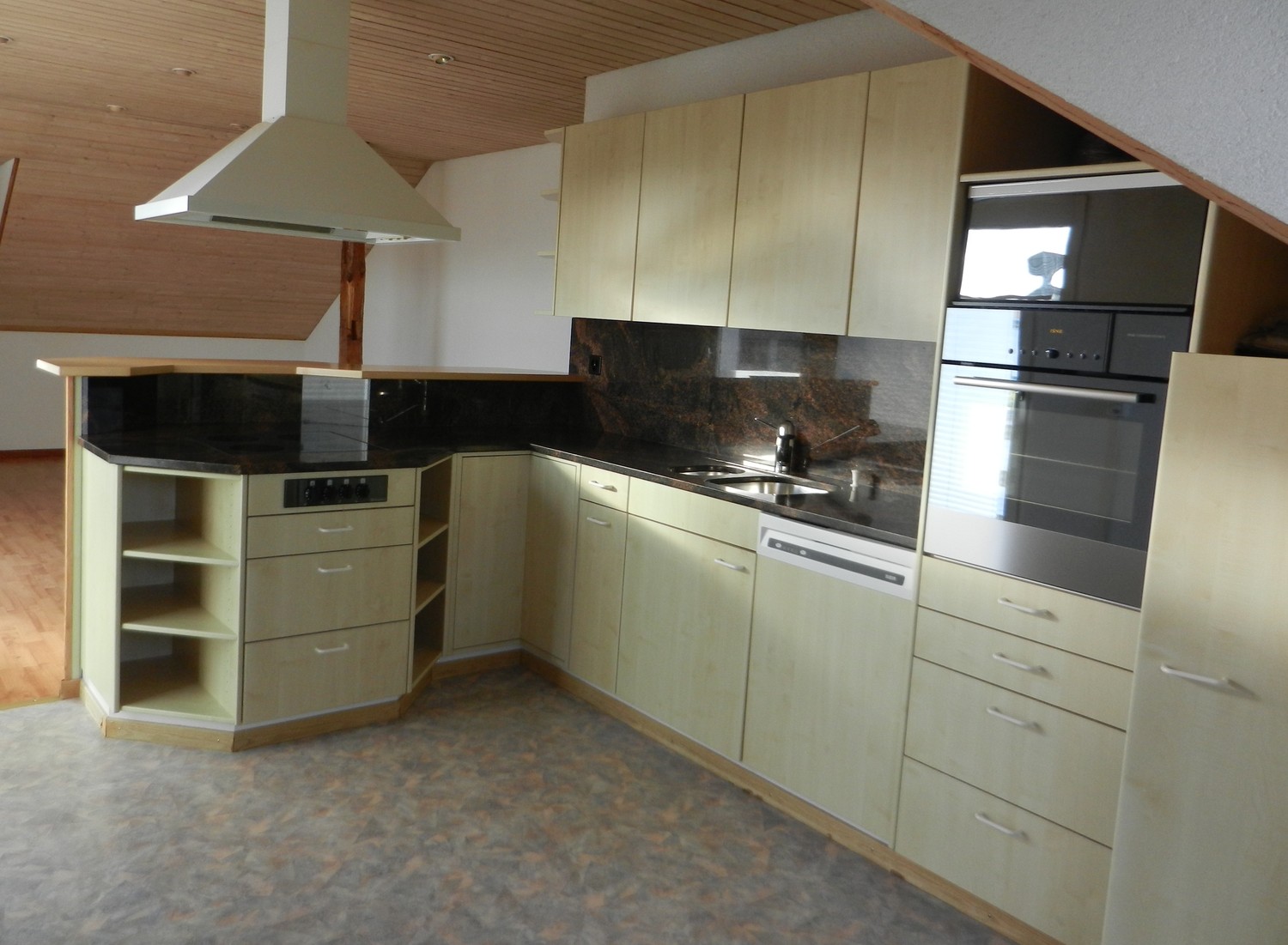 Wohnküche: Ausgestattet mit Granitarbeitsplatten, Einbaubackofen/Steamer, Geschirrspüler, Dunstabzugshaube