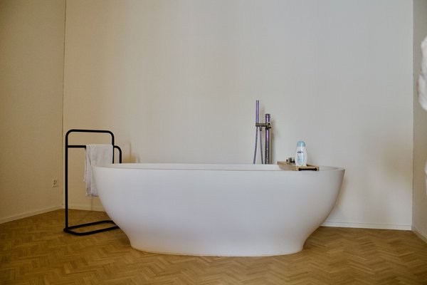 Gemütliches Schlafzimmer mit eigener freistehender Badewanne und Zugang zum Bad