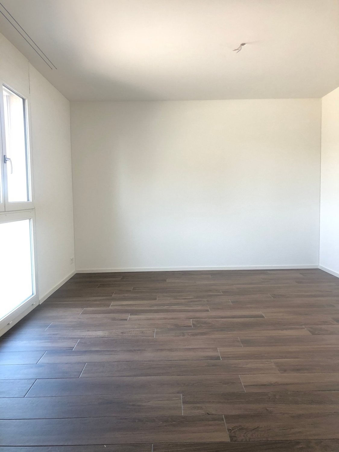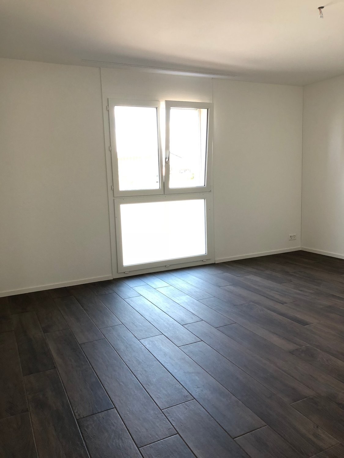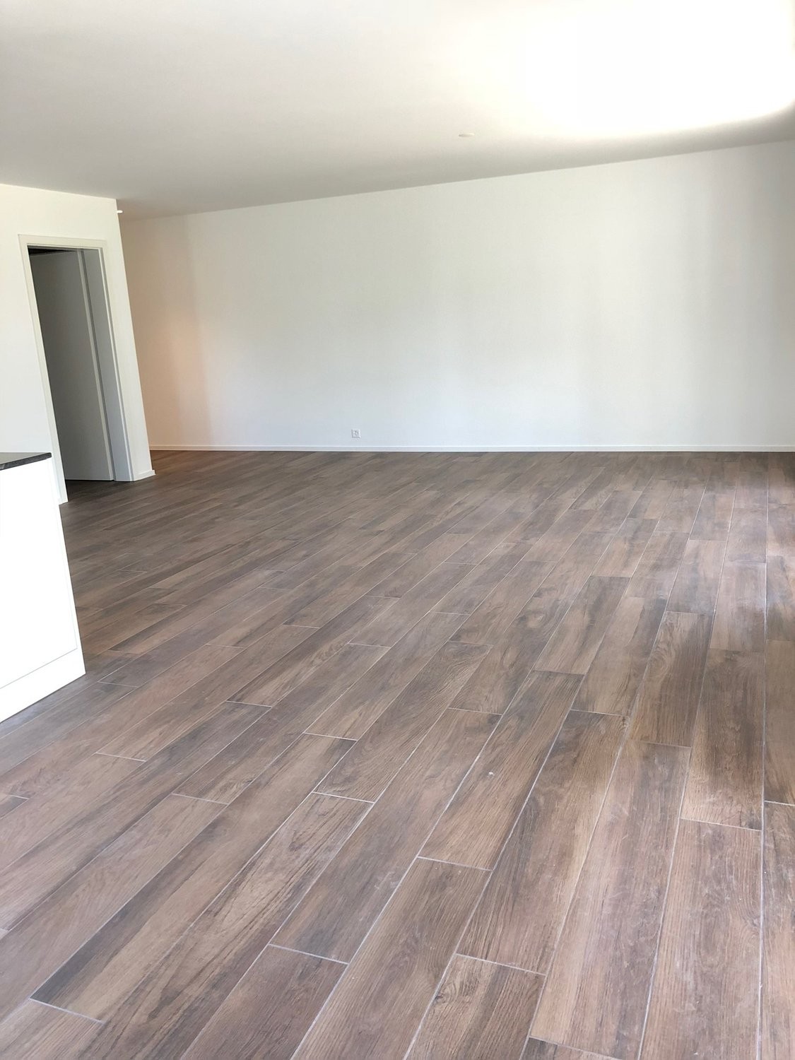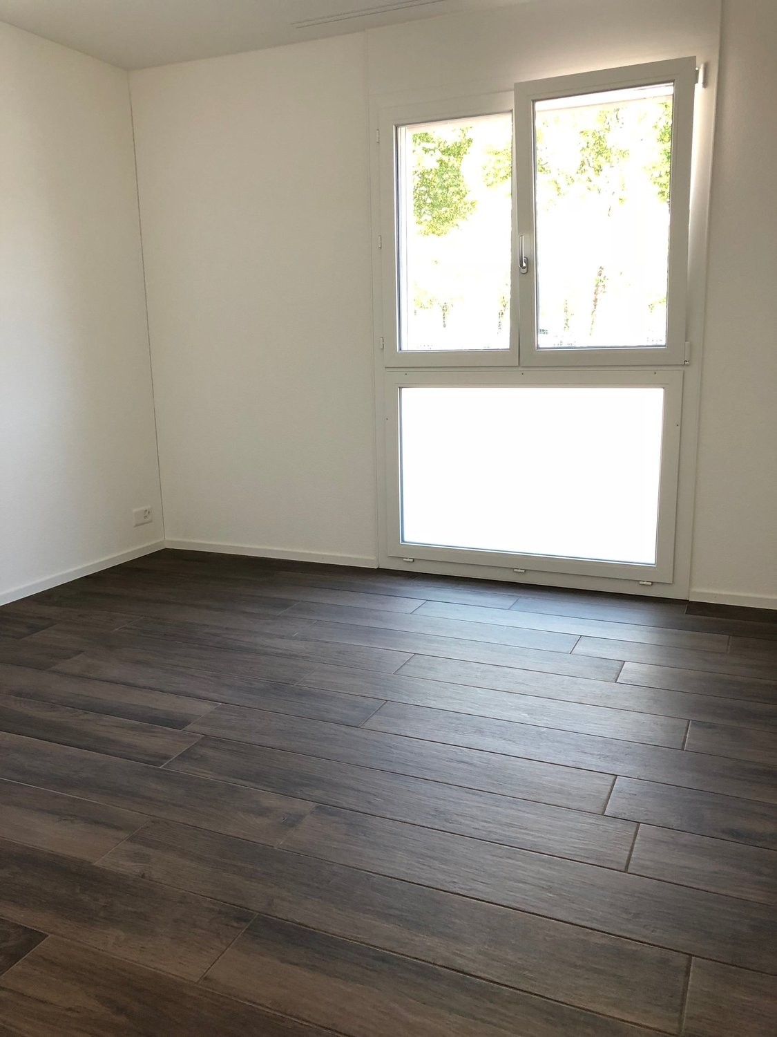Grosszügige Zimmer: Helle Räume mit Plattenboden in Holzoptik und grossen Glasfenstern für viel Tageslicht