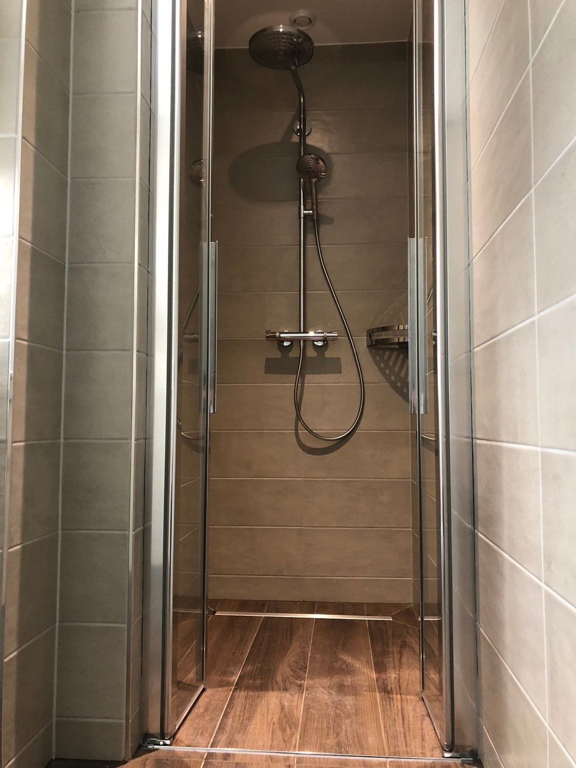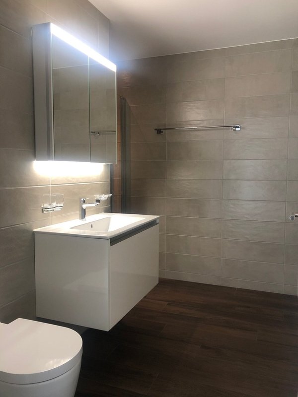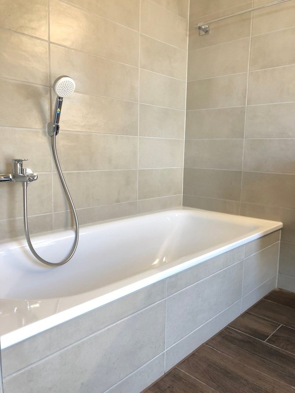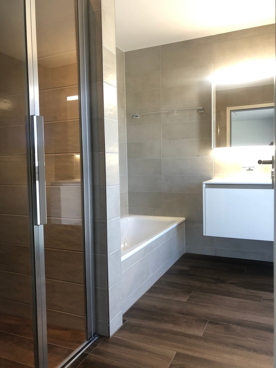 Zwei moderne Badezimmer: Eines mit weisser Badewanne und Dusche, moderne, beige geflieste Wände und Chrom-Armaturen