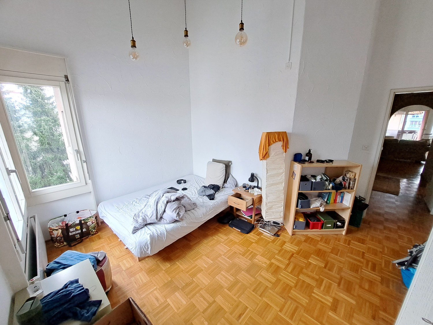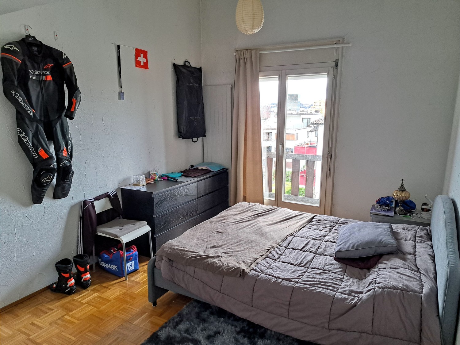 Es gibt ein grösseres Schlafzimmer (14 m², siehe Grundriss Bilder) und ein kleineres Schlafzimmer (13m², aktuell meines). Wir können noch besprechen, wer welches Zimmer nimmt. Das kleinere Zimmer ist etwas günstiger (1450 CHF) und hat den schöneren Blick über Oerlikon, das Grössere ist dafür besser geschnitten und hat einen kleinen Balkon. Die Zimmer sind eher klein, dafür mit hoher Dachschräge gefühlt geräumig und kühl nordseitig gelegen. Auch sind sie bereits (teil-)möbliert und können kostenfrei übernommen werden.