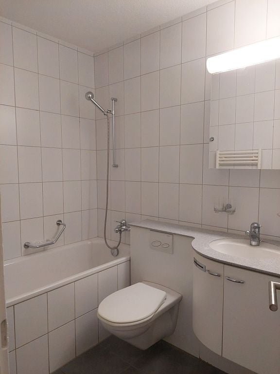 . Helles Badezimmer mit Badewanne, WC und Lavabo.