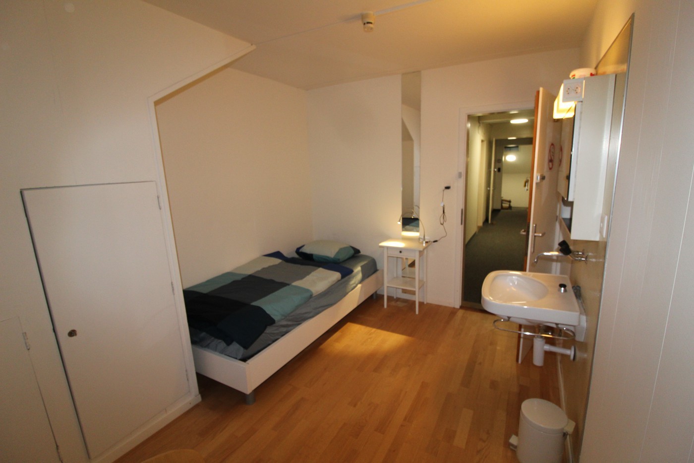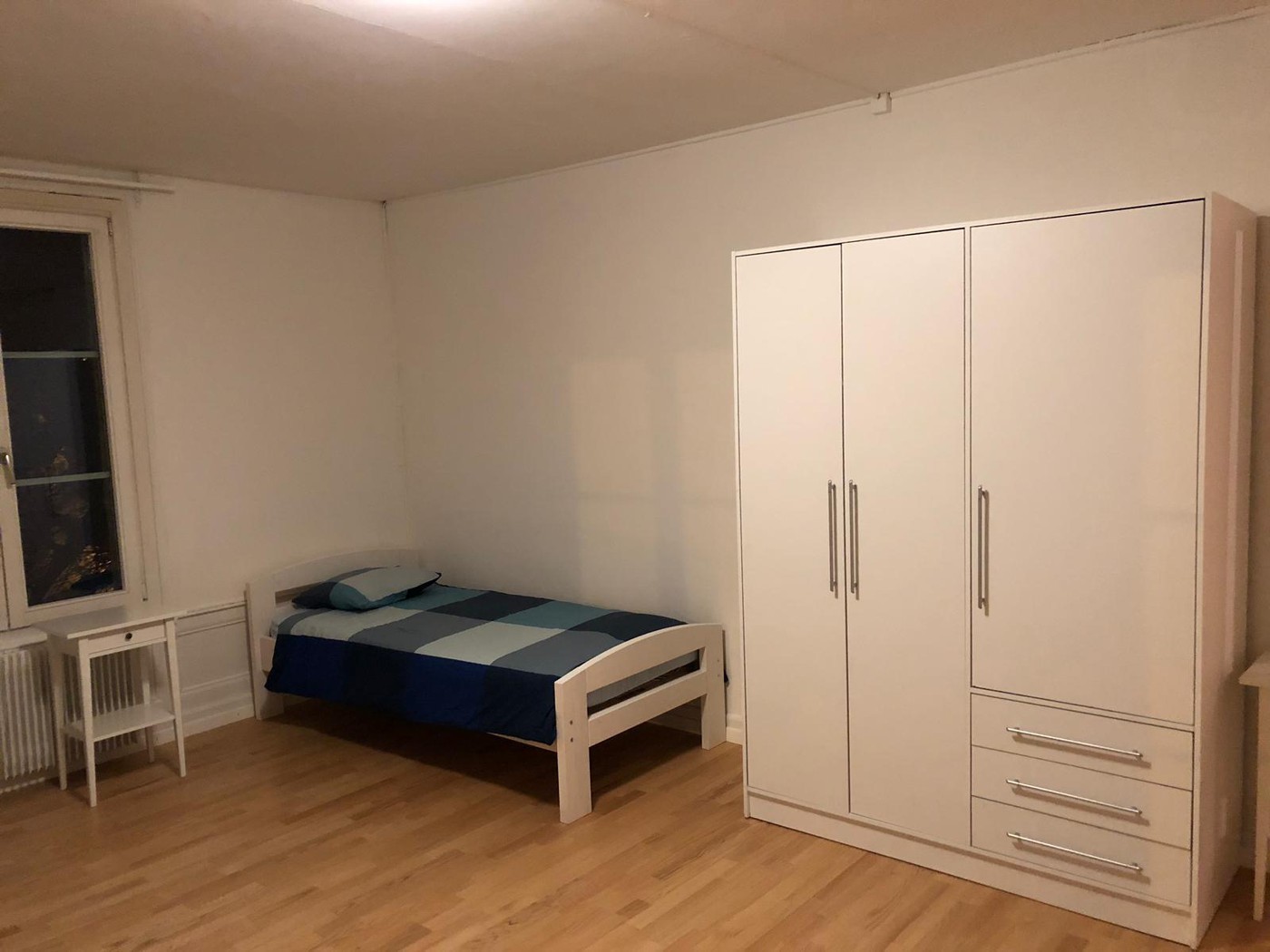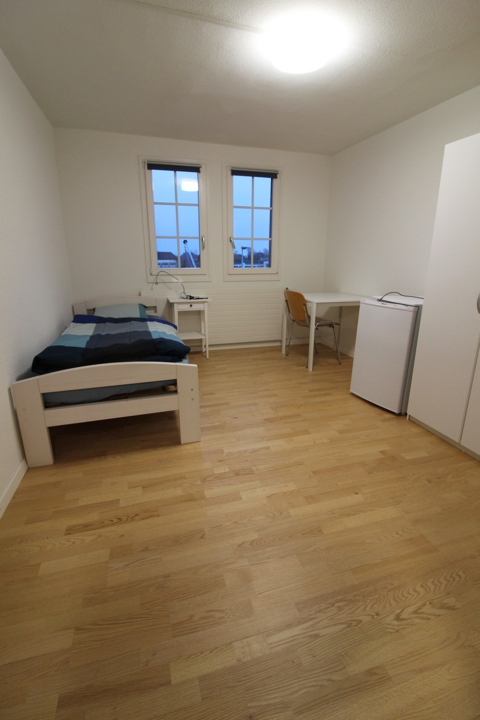 Zimmer möbliert mit einem Bett, einem Nachttisch, einer Nachttischlampe, einem Tisch, Stuhl, Schrank und einem Kühlschrank. Die Bettwäsche und Spiegelschnelles WLAN sind inklusive.