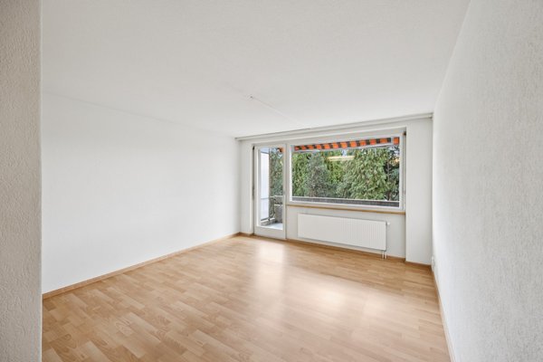 Das grosszügige ausgelegene Wohnzimmer bietet Ihnen beim Entspannen wunderschöne Aussicht auf die Natur. Zudem ist der Balkon ganzjährig der perfekte Ort für Erfrischung.