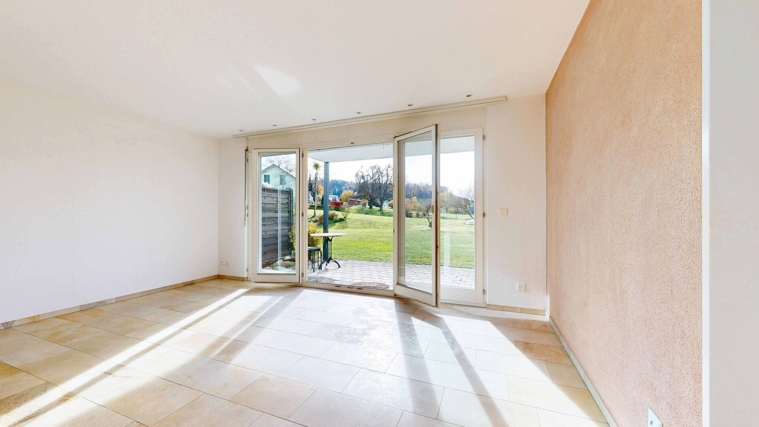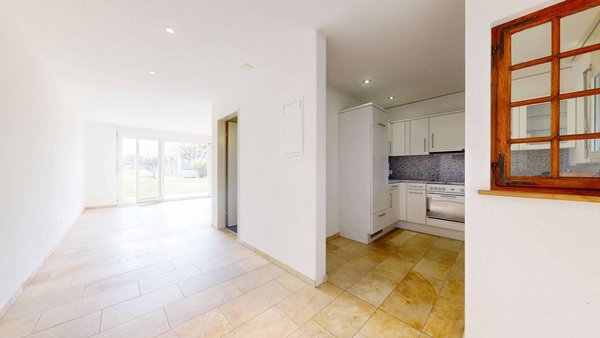 Beim Betreten der Wohnung empfängt Sie ein heller Eingangsbereich mit Garderobe. Der grosszügige Wohn- und Essbereich schafft ein gemütliches Ambiente und lädt zum Verweilen ein. Die modernen Fenster bieten einen schönen Ausblick ins Grüne und sorgen für viel Tageslicht.