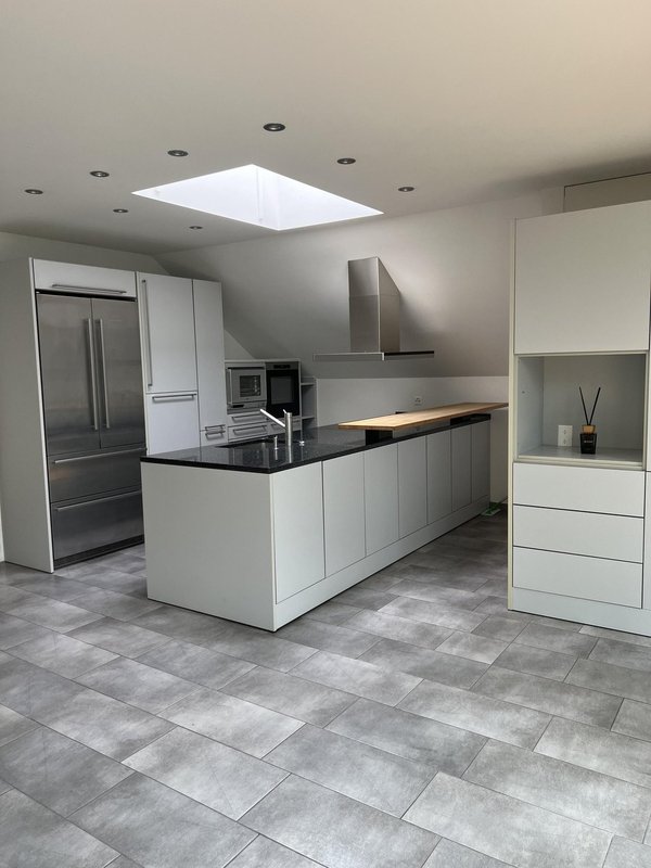 Offene Küche mit Kochinsel und 5-Platten-Glaskeramik-Kochfeld, Geschirrspüler und Steamer