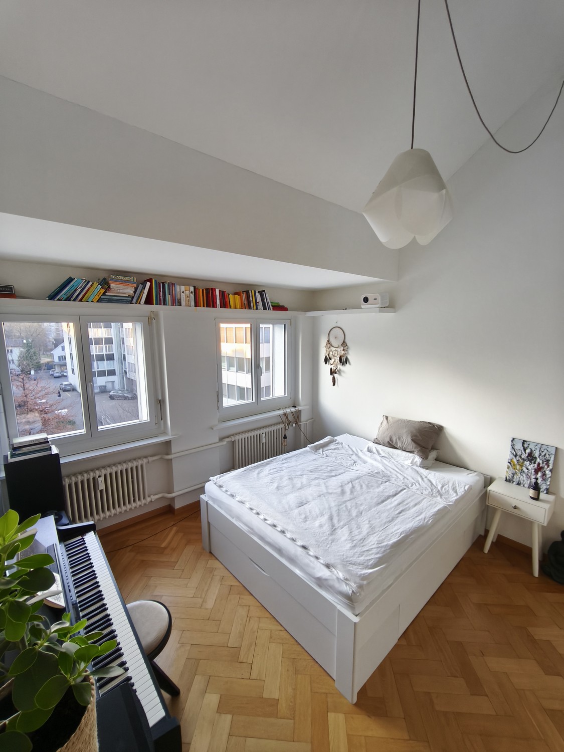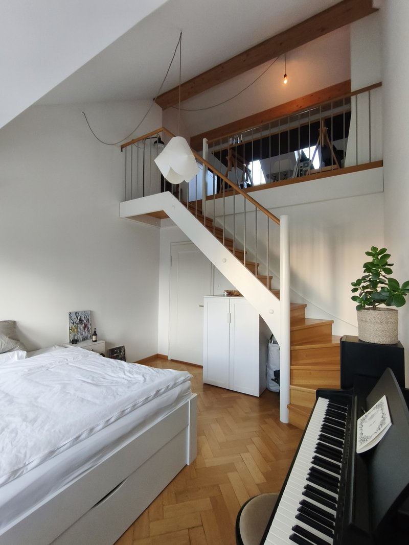 Highlight ist das Schlafzimmer mit Maisonetteraum mit oberem Arbeits-/Kreativbereich. Nutzung der Instrumente nach Absprache möglich.