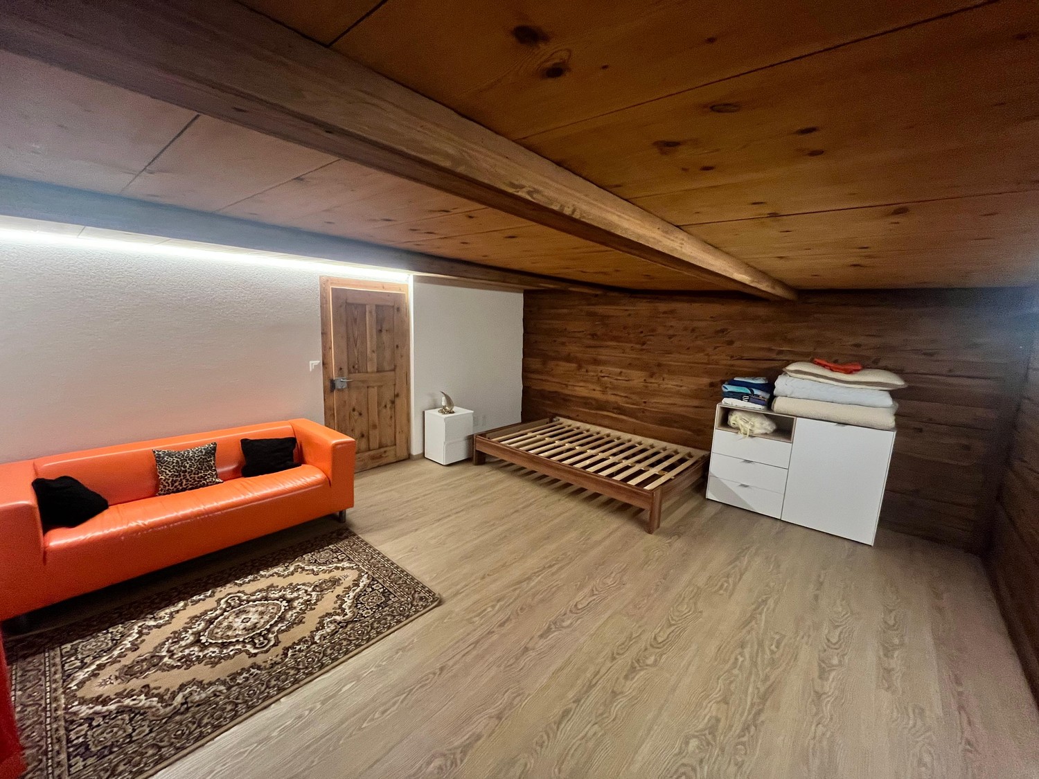 Wohn-/Schlafbereich - Bett - Sofa - Satelliten-TV oder Kupferanschluss für Internet vorhanden (Abonnement muss selbst gelöst werden) - Holzverkleidete Wände und Decke im Chalet-Stil