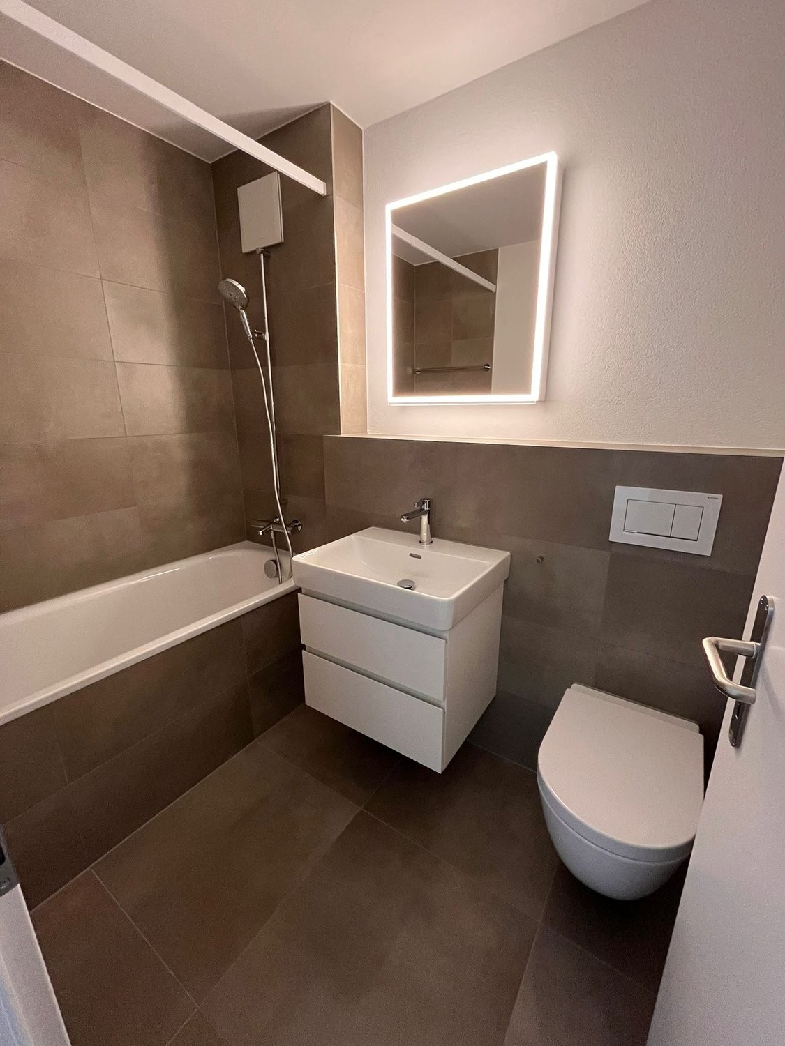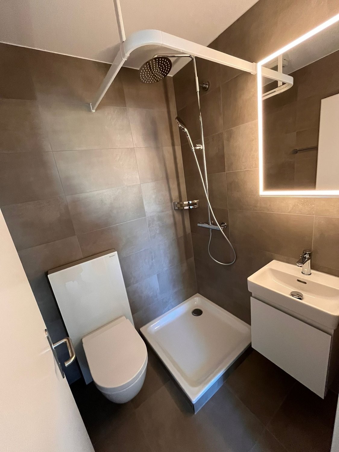 - Nasszellen mit hellbraunen Keramikplatten, begehbarer Dusche und Badewanne