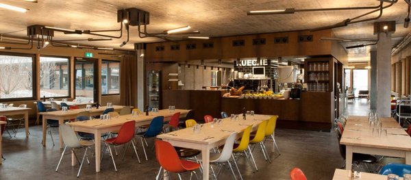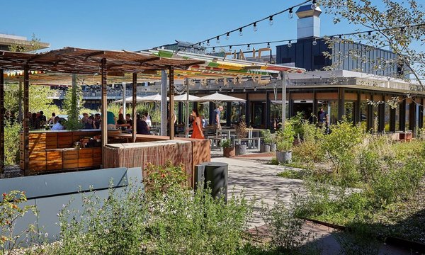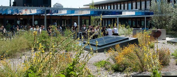 Modernes Büro mit Kantine und grüner Dachterrasse.