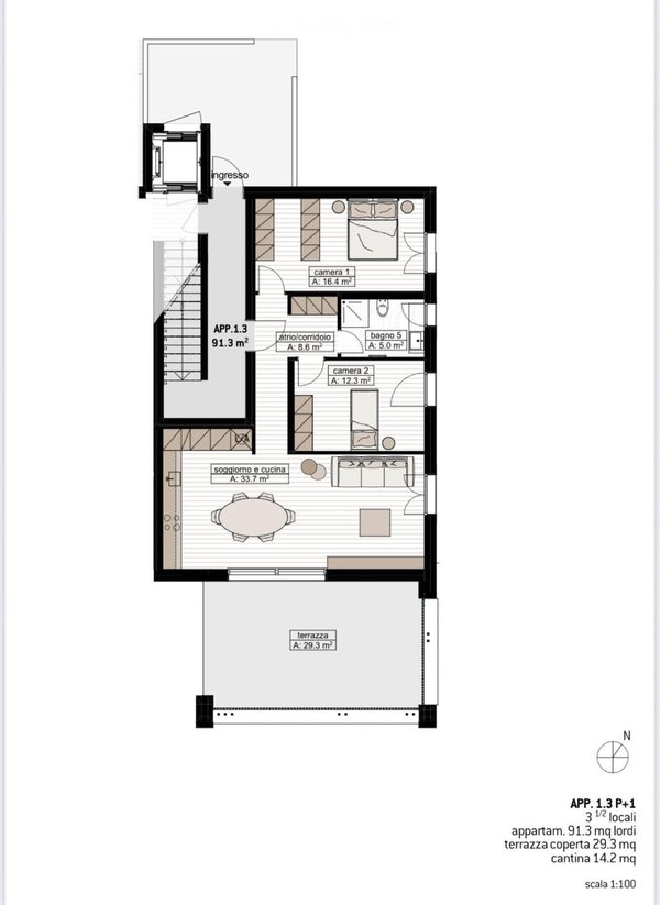 - ampio soggiorno con cucina a vista (con elettrodomestici a basso consumo energetico), apertura con ampia finestra che porta al grande terrazzo coperto con parziale vista lago.