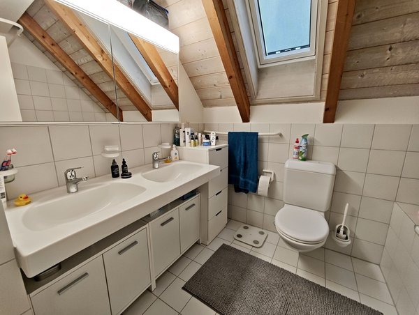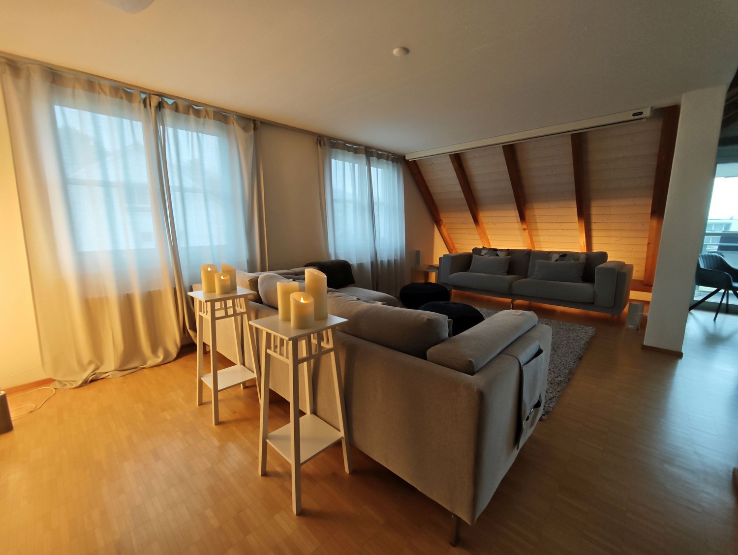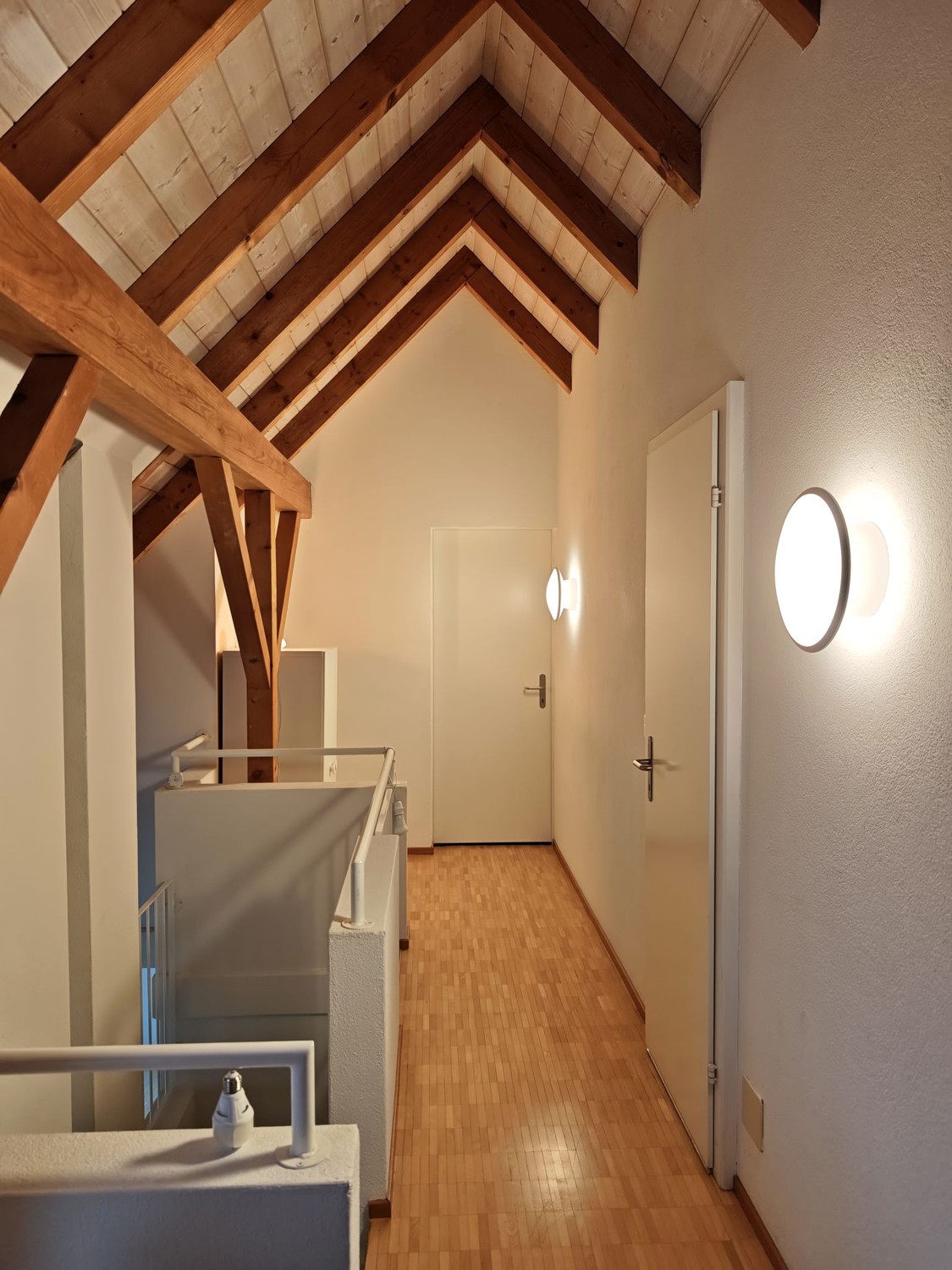 Diese wunderschöne, lichtdurchflutete 4.5-Zimmer-Maisonette-Wohnung überzeugt mit hohen Räumen, sichtbaren Holzbalken und einem warmen, gemütlichen Wohngefühl. Der grosszügige Grundriss, die moderne Ausstattung und der Balkon mit herrlicher Aussicht ins Grüne bieten idealen Wohnkomfort für Paare und Familien.
