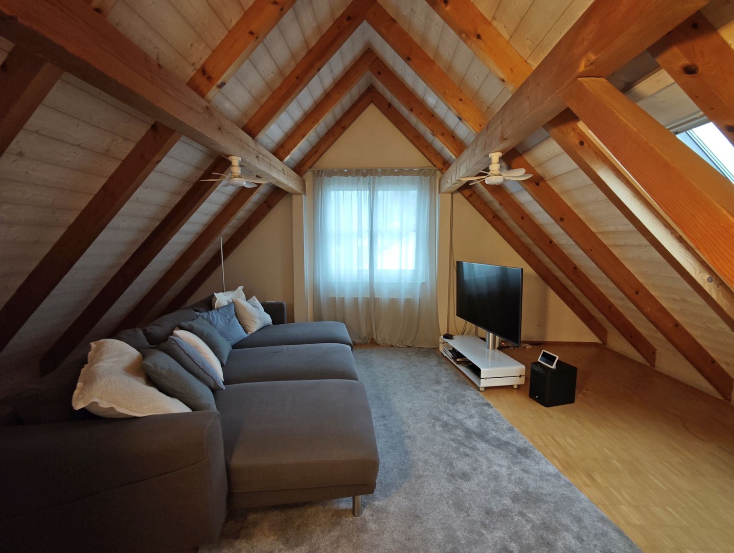 Der offene Mehrzweckraum im Obergeschoss eignet sich perfekt als TV-Lounge, Büro, Fitness- oder Hobbybereich. Dank der Kombination aus modernem Ausbau und ruhiger, naturnaher Lage entsteht ein besonders angenehmes Wohnambiente.