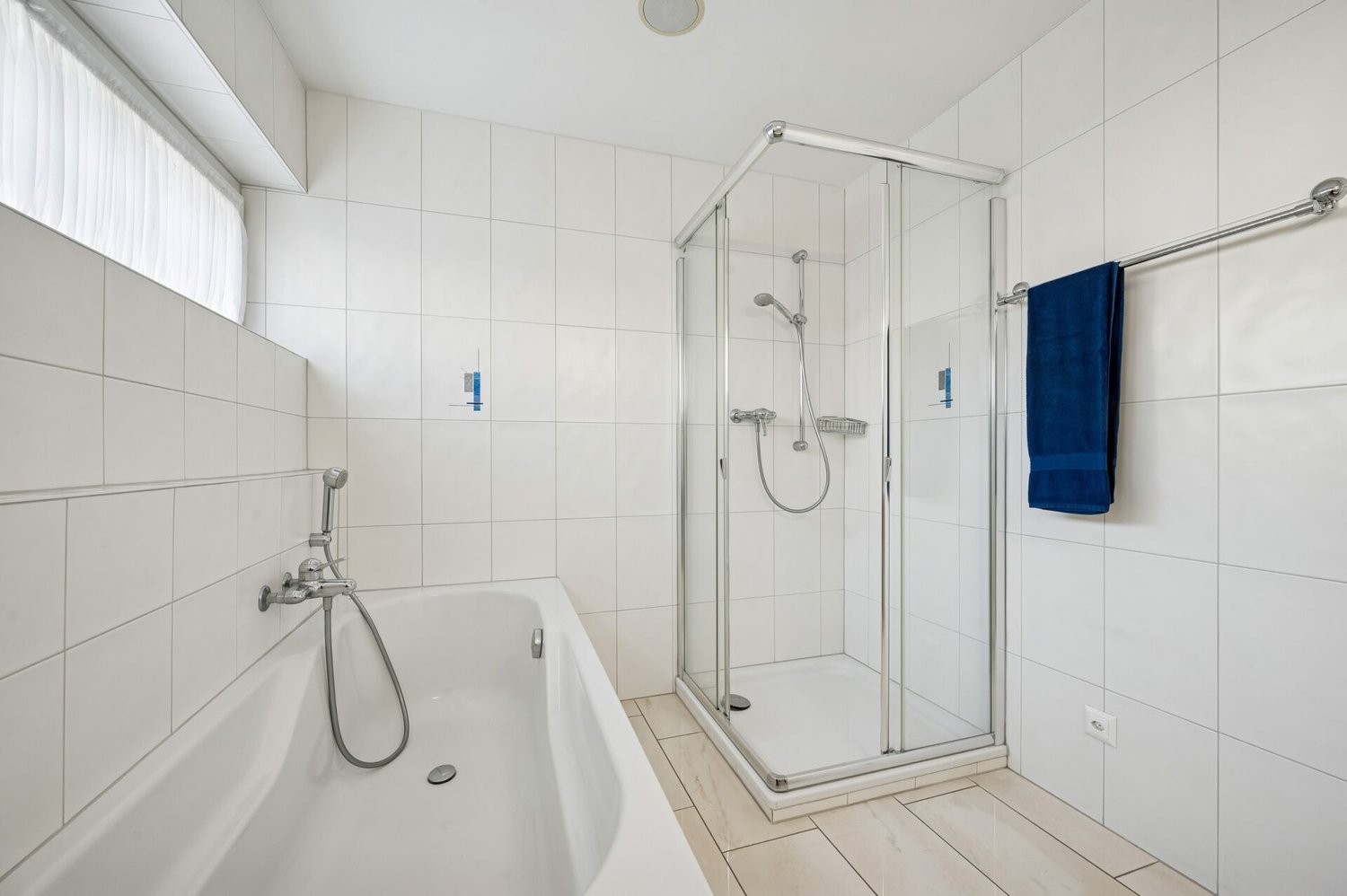 Zwei Nassräume: einmal mit Dusche, einmal mit Dusche und Badewanne