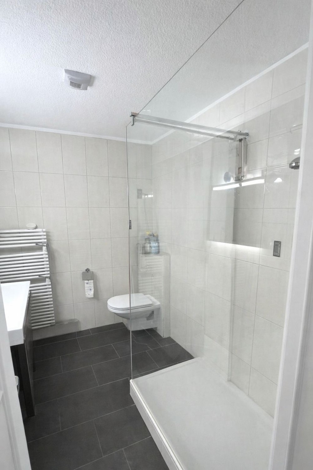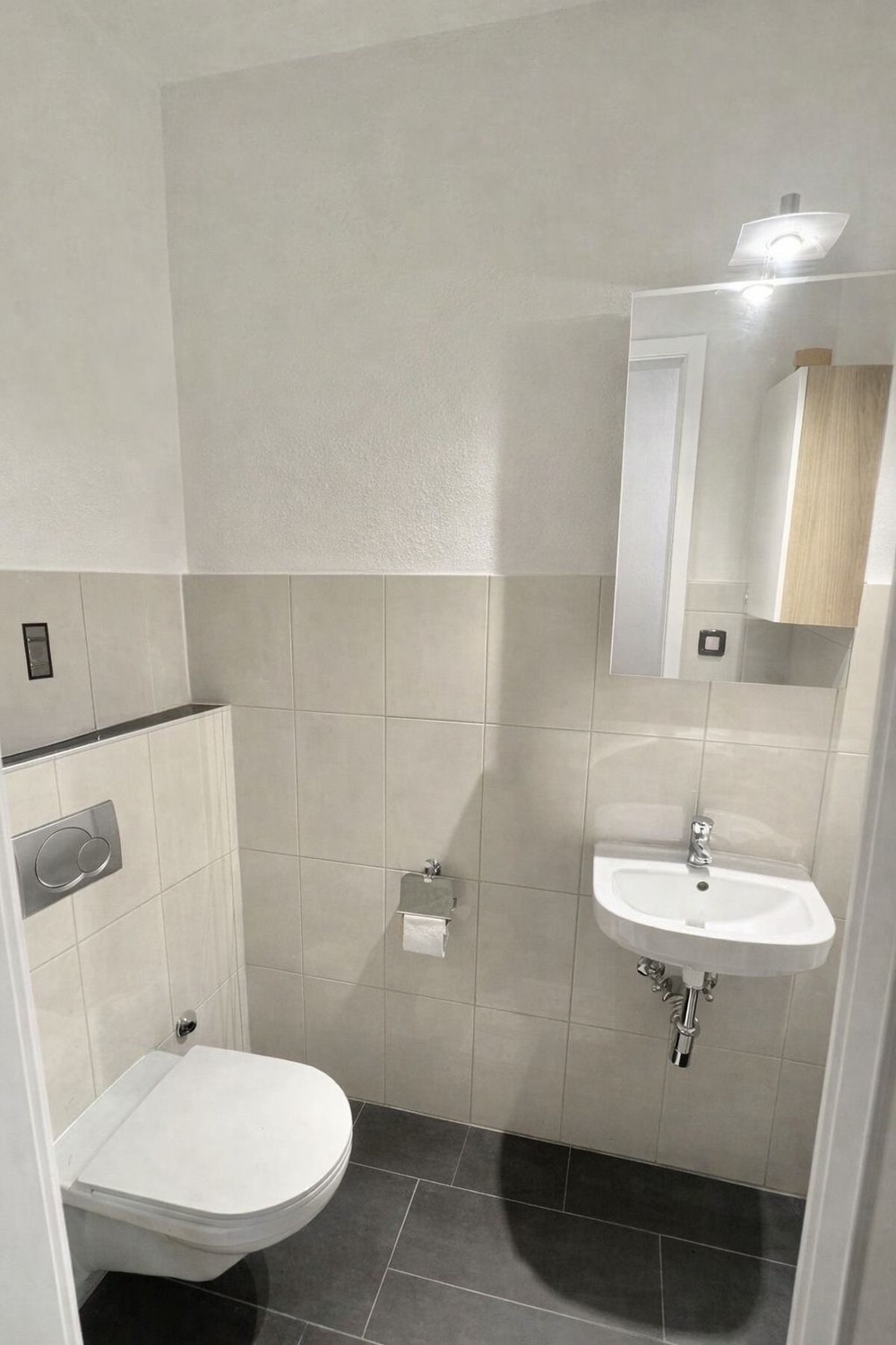 Die Wohnung verfügt über zwei moderne Nassbereiche: ein Badezimmer mit Dusche sowie ein separates WC. Beide präsentieren sich in einem modernen und gepflegten Zustand. Eine eigene Waschmaschine direkt in der Wohnung sorgt für zusätzlichen Komfort im Alltag.