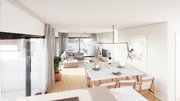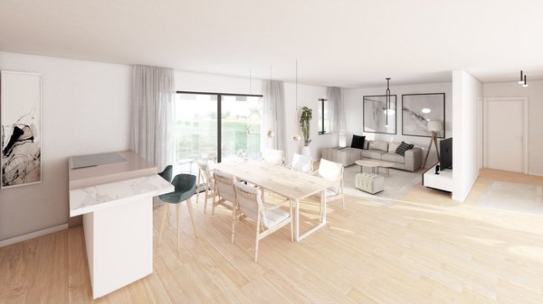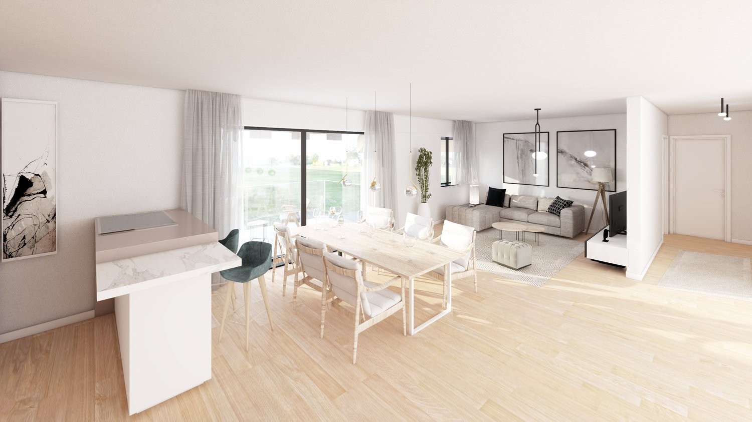 Der weitläufige Wohn- und Essbereich mit moderner, offen gestalteter Küche bildet das stilvolle Zentrum der Wohnung – ideal für gemütliche Abende, Gäste oder das tägliche Familienleben.