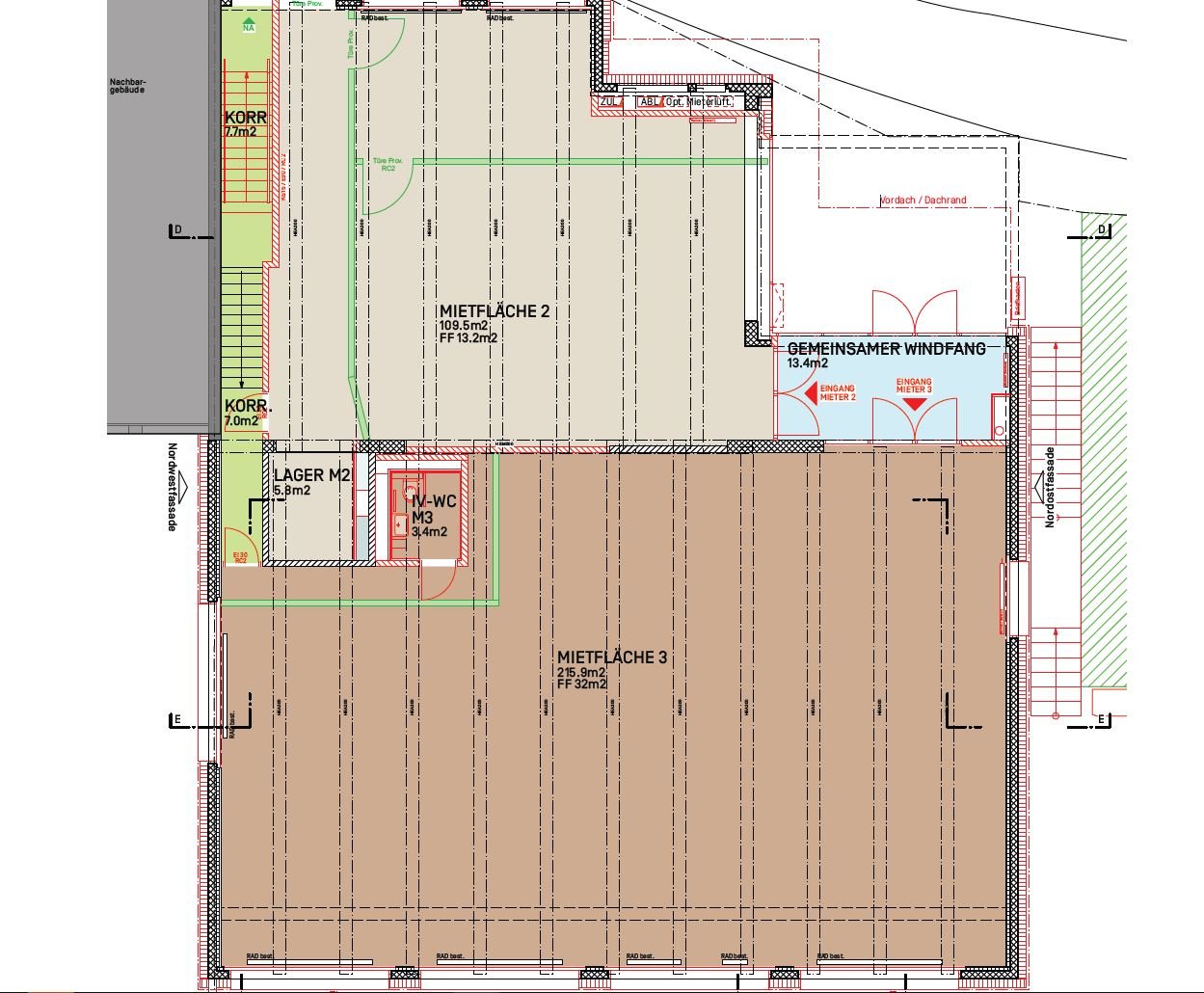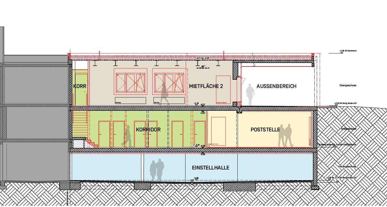 Die Fläche von ca. 115 m2 im Obergeschoss (siehe Grundrissplan Mietfläche 2, grau markiert) befindet sich an bester Lage in Worb. Wenige Gehminuten entfernt hat es viele Einkaufsmöglichkeiten, der Bus, das Tram und der Bahnhof ist direkt vor der Haustüre.