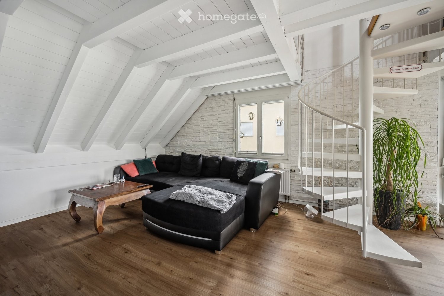 Charmanter Dachbereich: Atmosphärisches Wohnen unter weissen Holzbalken mit Atelier, Schlafzimmer; Douche mit eignem Waschturm und Wendeltreppe