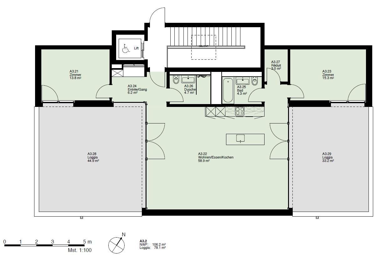 Die Wohnung befindet sich im 3. Obergeschoss, verfügt über 107 m² und ist wie folgt ausgestattet: