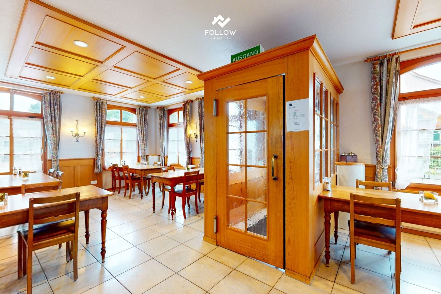 Im Erdgeschoss empfängt ein grosser Saal mit direktem Zugang zur Terrasse seine Gäste, ergänzt durch eine gemütliche Gaststube mit Buffet, einen kleineren Saal sowie die dazugehörige Restaurantküche. Das darüberliegende Stockwerk beherbergt verschiedene Räume die nach einer Renovation attraktiven Wohnraum bieten könnte. Im Dachgeschoss befindet sich eine 4.5-Zimmer- Wohnung mit Terrasse die viel Charme verstreut. Ergänzt wird das Angebot durch Kellerräume, Kühlräume und weitere funktionale Flächen.