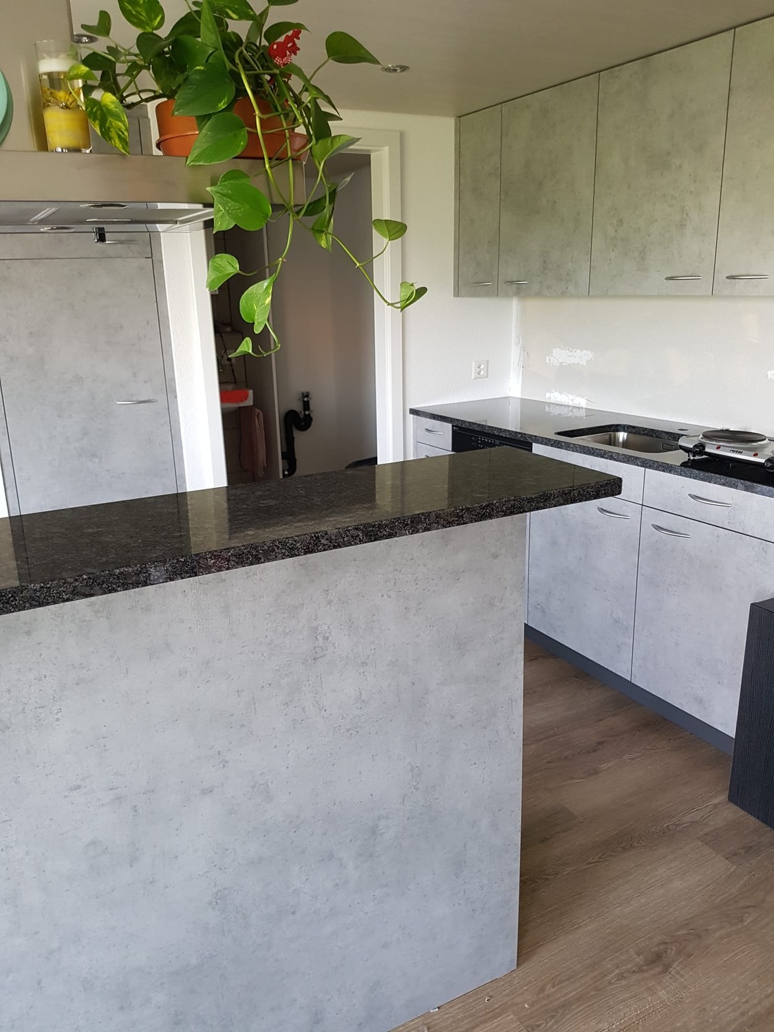 Moderne offene Küche: Geniessen Sie das Kochen in einer grosszügigen Küche mit einer stilvollen Kochinsel und einem Geschirrspüler, der Ihnen das Leben erleichtert.