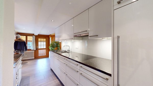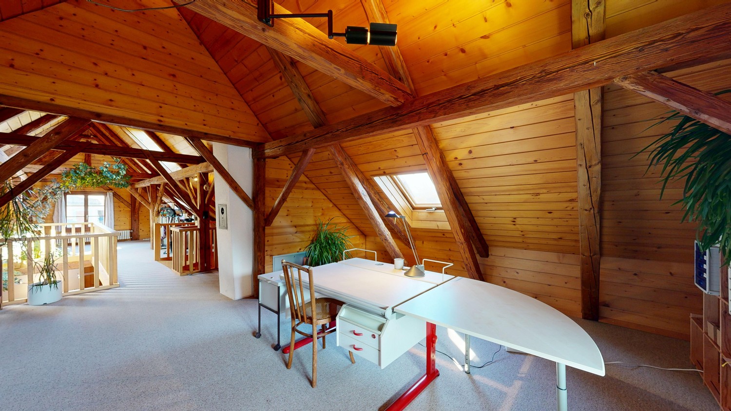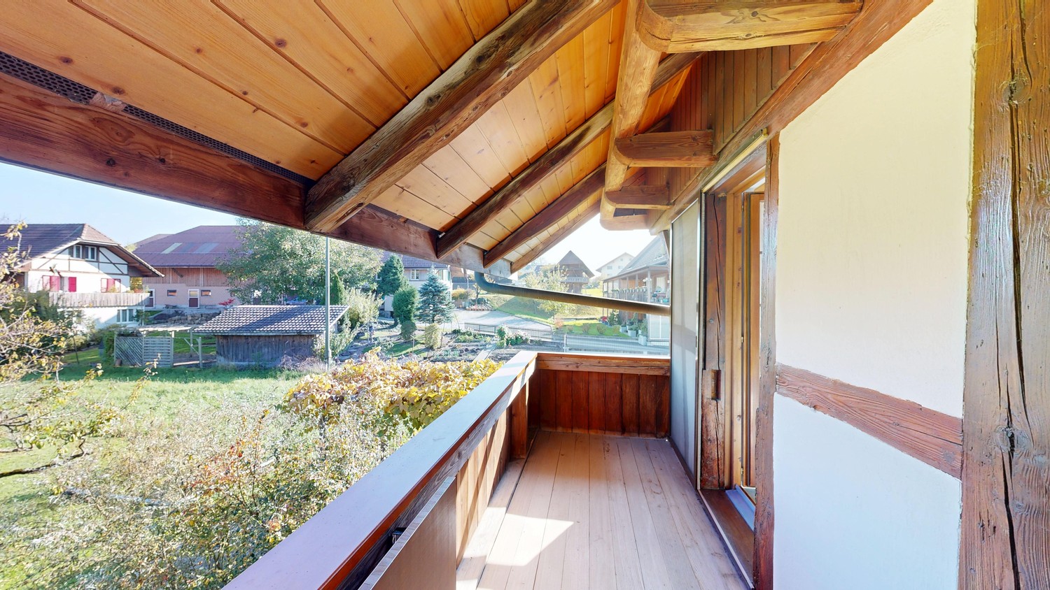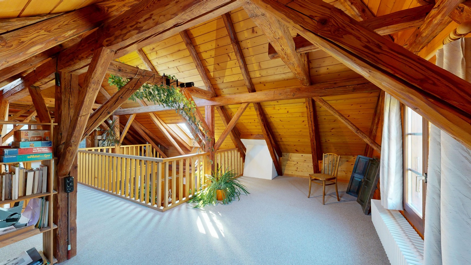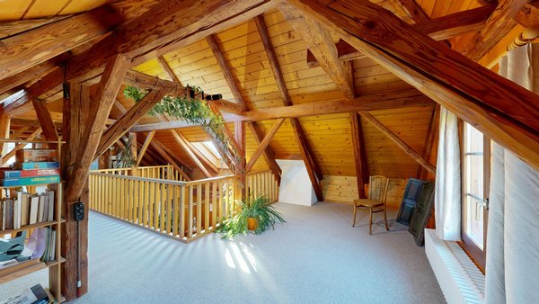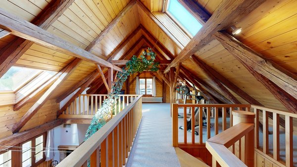 Über den Balkon/Laube im Obergeschoss gelangen Sie in die 5 ½ Zimmer-Wohnung mit Galerie. Der einladende Eingangsbereich bietet Platz für eine Garderobe. Die Küche lädt zu gemütlichen Kochabende ein und ist wie folgt ausgestattet: Glaskeramikkochfeld, Dunstabzug, Backofen, Geschirrspüler, Kühlschrank mit Gefrierfach, Granitabdeckung usw. Durch die Küche erreichen Sie das Badezimmer 1, ausgestattet mit Dusche, WC, Lavabo und Fenster. Das Badezimmer 2 befindet sich beim Essbereich und verfügt über eine Badewanne, WC, Lavabo, Fenster sowie ein praktisches Reduit. Das Cheminée im grosszügigen Essbereich sorgt an kalten oder regnerischen Tagen für wohlige Wärme und eine angenehme Atmosphäre. Das lichtdurchflutete Wohn- oder Schlafzimmer 2 bietet Zugang zur Laube/Balkon mit Blick in den Garten. Die beiden Schlafzimmer 3 und 4 befinden sich nebeneinander und sind vom Essbereich aus zugänglich. Eine Treppe führt vom Essbereich ins Galeriegeschoss. Dort befinden sich die offene Galerie sowie ein weiteres Büro-/Schlafzimmer 5, das aktuell offen gestaltet ist.