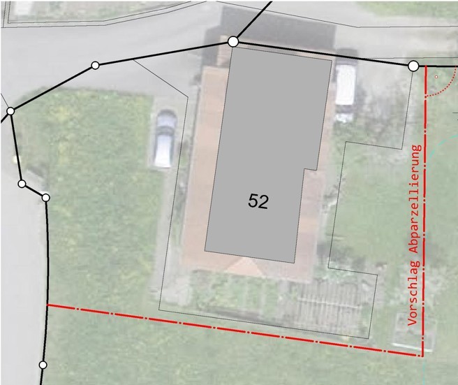 Das bestehende Grundstück mit einer Gesamtfläche von 3'406 m2 wird im Zuge des Verkaufs abparzelliert. Für das 2-Familienhaus ist eine Parzellengrösse von 683 m2 vorgesehen. Weitere Informationen finden Sie in der Verkaufsdokumentation.