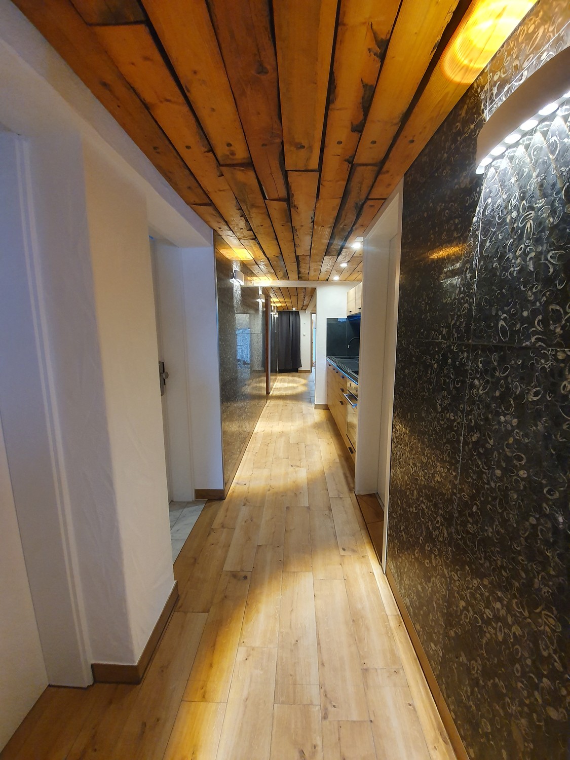 Sämtliche Böden sind gefliest, Wände z.T. Mit Naturstein, Klosterputz oder Baumwollputz mit Glitzer, Bodenheizung, Recooling, Klimaanlage im Dachgeschoss, elektrische Dachfenster mit Sonnenlammellenstoren, Verdunklungsvorhänge