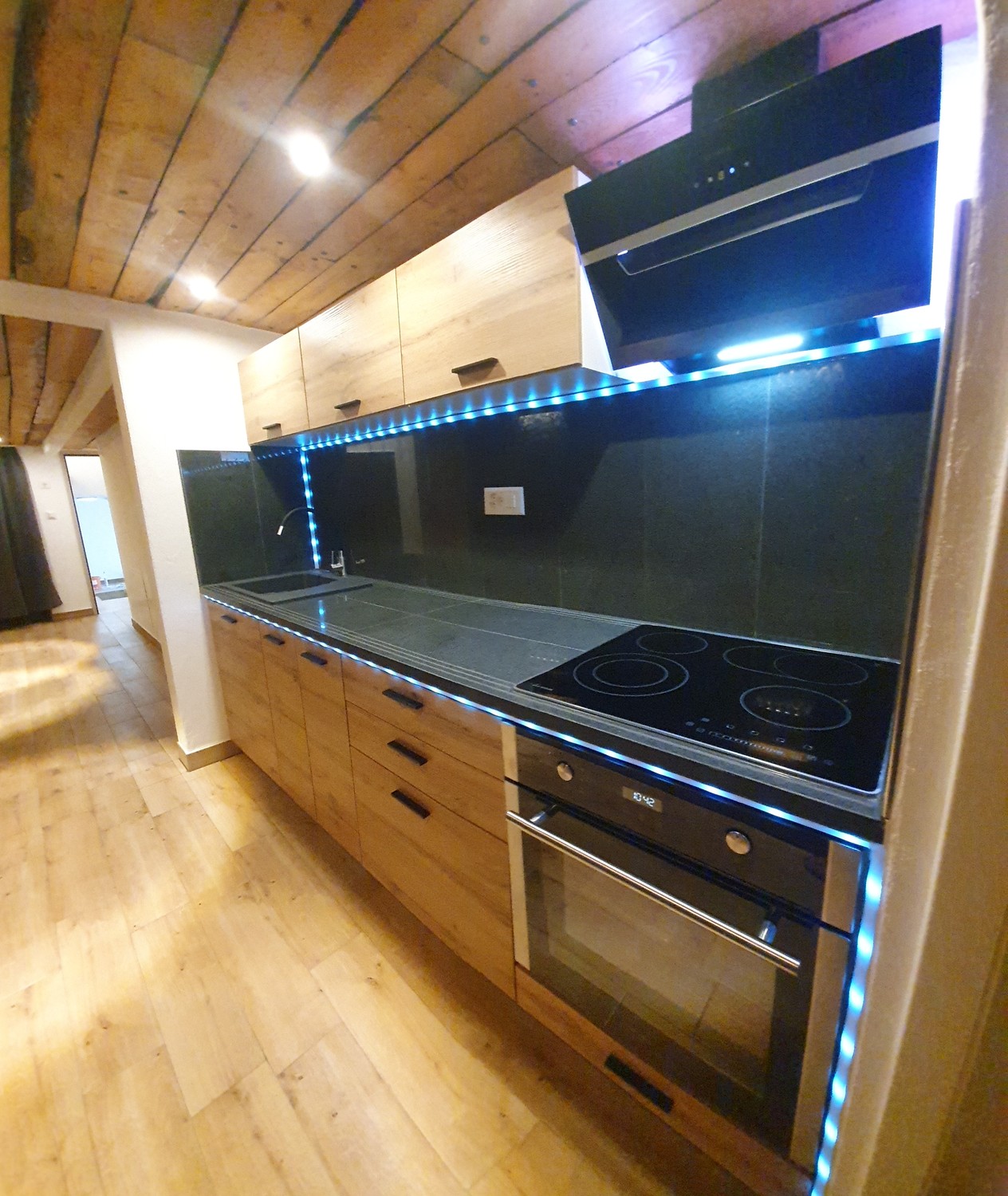 Küche mit Natursteinabdeckung, Möbelunter- Beleuchtung und LED- Streifen mit Farben, Dunstabzugshaube die übers Dach geführt wird, Lavabo mit verstellbarem Wasserarmatur, diverse Schränke
