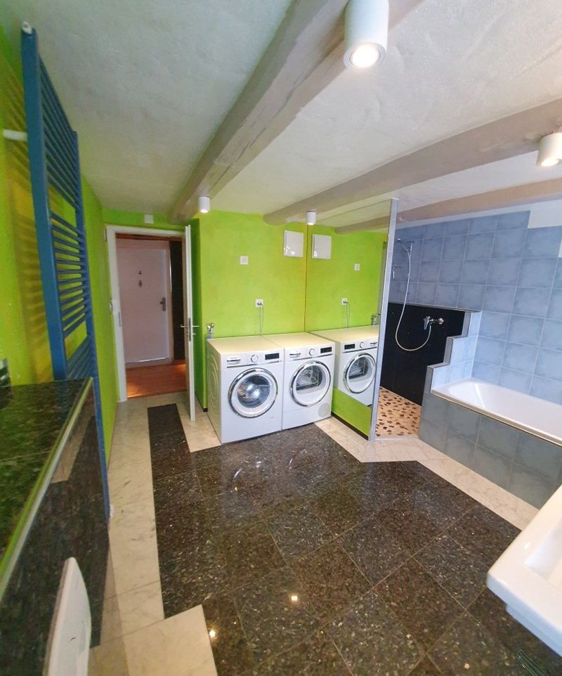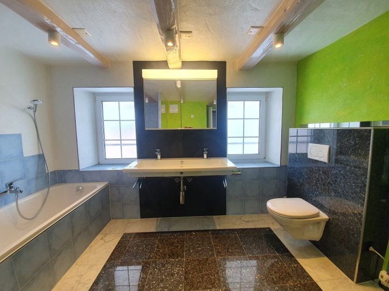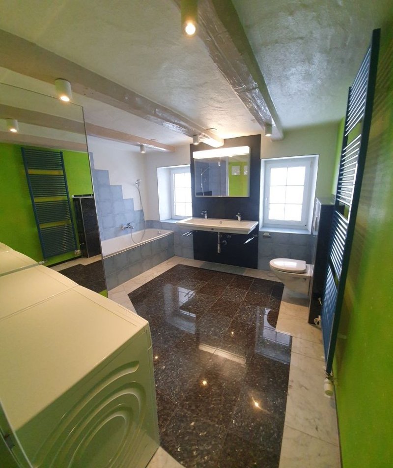 Grosszügiges Badezimmer mit begehbarerer, grosser Dusche, Badewanne, Unterputz-WC, mit Spiegelschrank und Lavabo, Waschmaschine und Tumbler mit Wasserabführung , Lüftung wird auch übers Dach entlüftet.