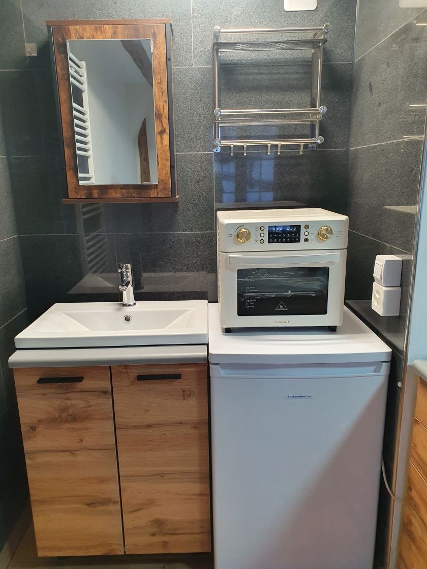 separates WC mit Spiegel und Monolith- WC, mit Lüftung die übers Dach geführt wird.