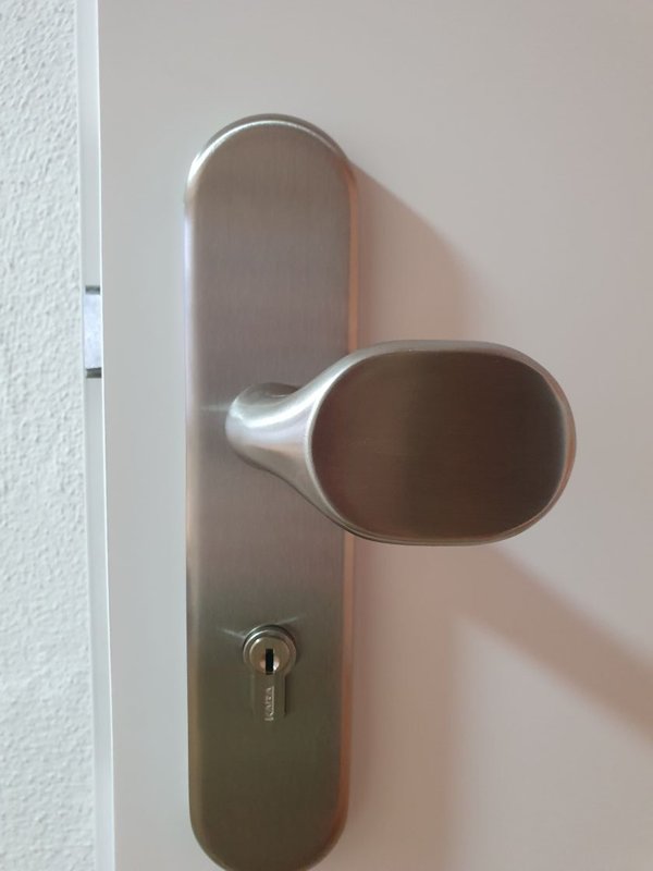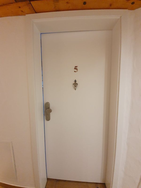 eine Hauszimmertüre, mit Klopfer, Spion und Kabaschloss, eigener Briefkasten