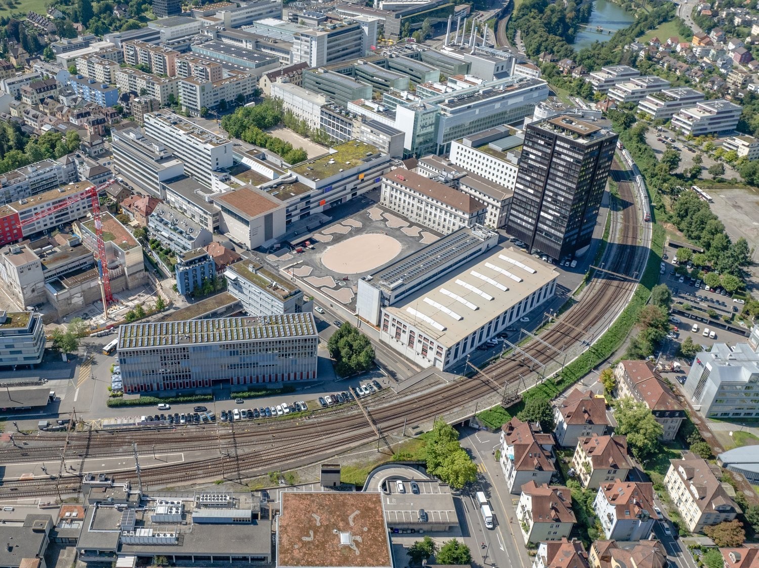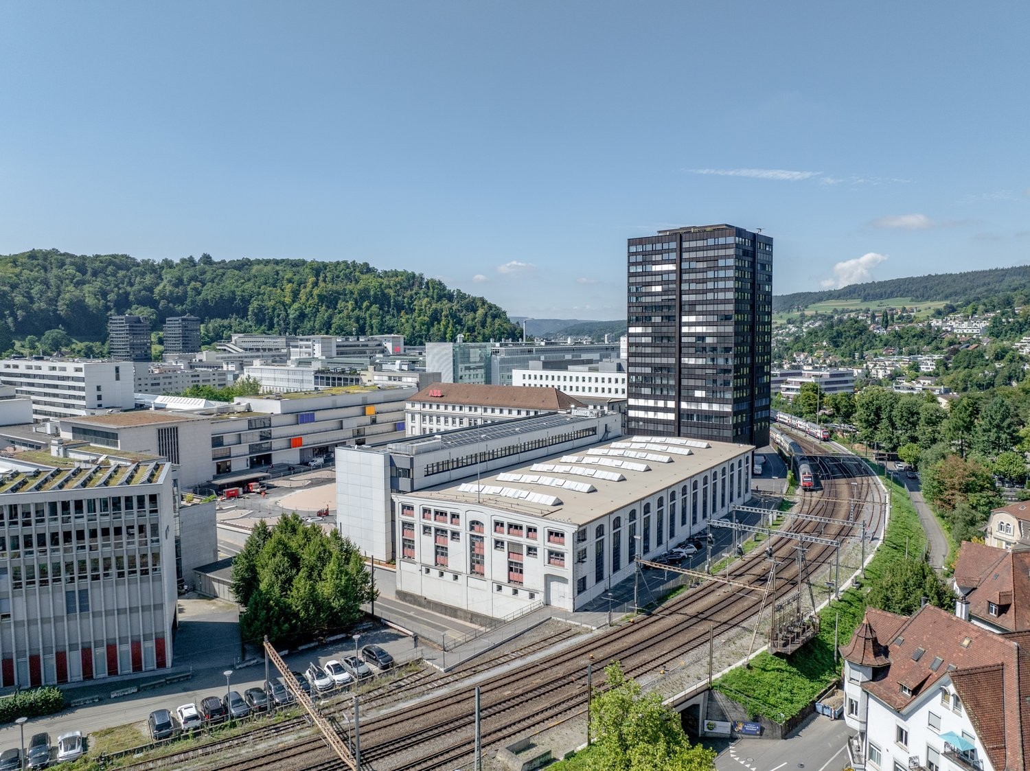 Der Gebäudekomplex mit angebautem Bürotrakt liegt am Brown Boveri Platz, der im nächsten Frühling wiedereröffnet und zum neuen Treffpunkt wird.