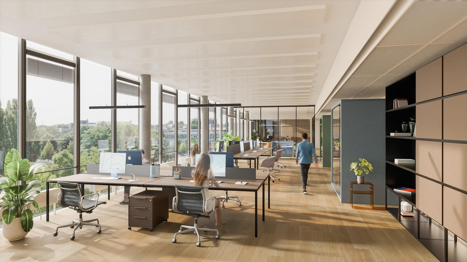Doppelboden, Glasfaseranschluss, Grundbeleuchtung, Akustikelemente. Hybriddeckensegel sorgen für angenehmes Raumklima, Lichtlenklamellen für Wärmeschutz.