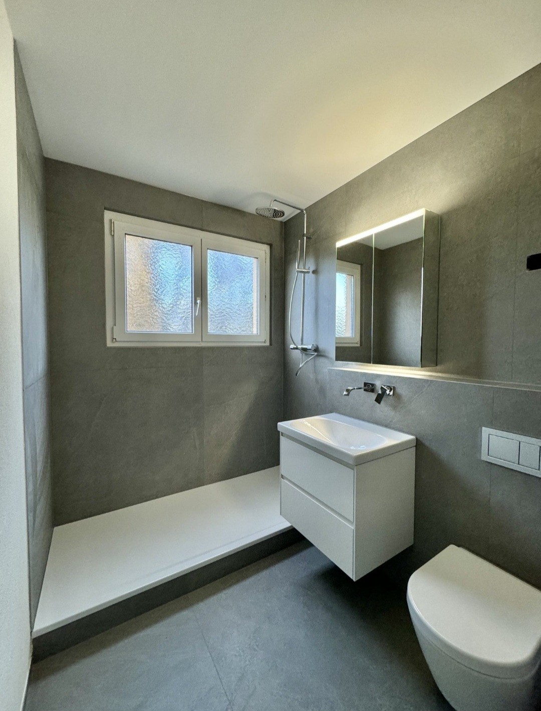 Echtholzparkett, Bad mit Steinplatten & Regendusche