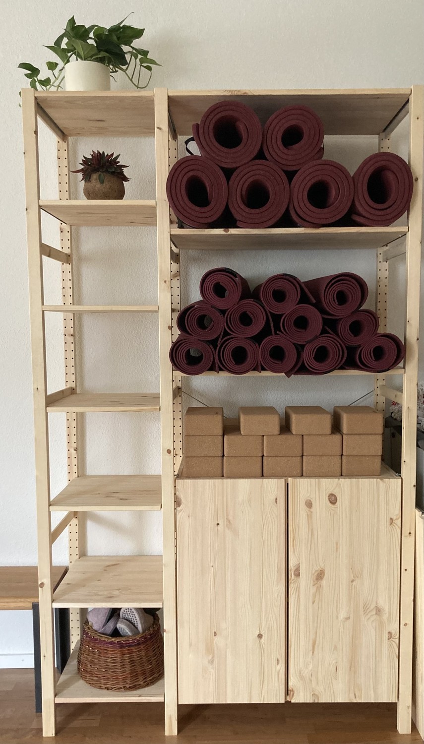 Ausstattung: Yogamatten, Blöcke, Kissen, Musikanlage & mehr