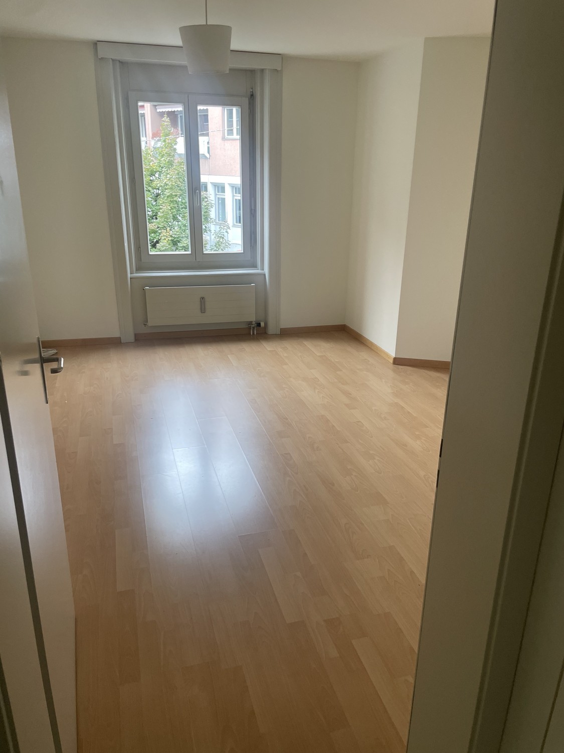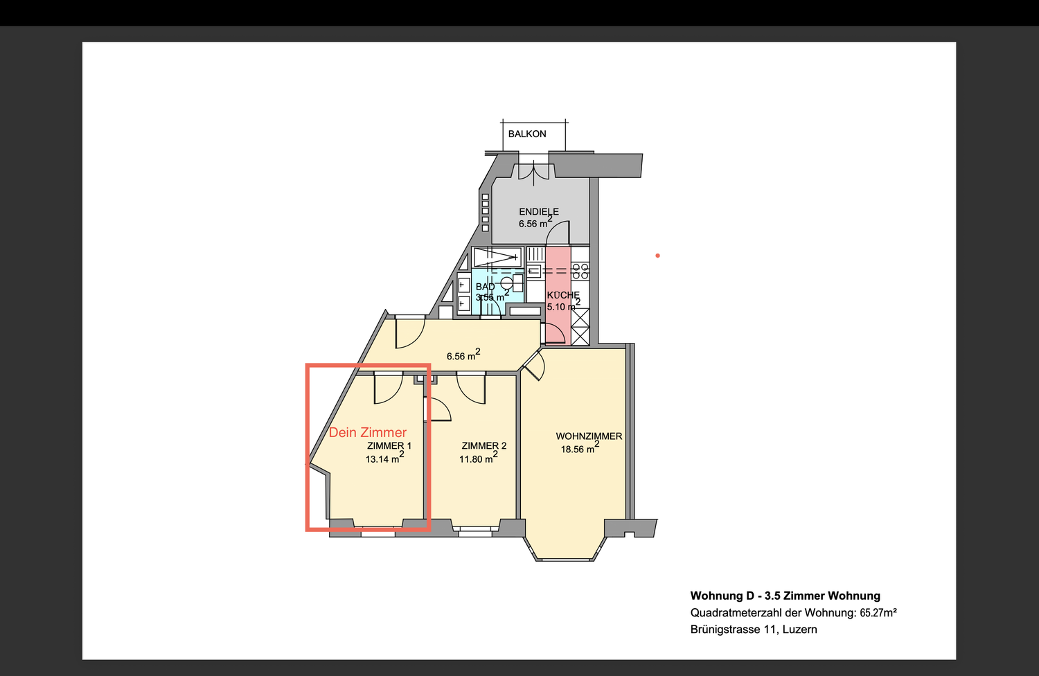 Das Zimmer ist 13.14 m² groß und hat einen besonderen, leicht versetzten Grundriss. Es ist hell und freundlich, mit einem großen Fenster, das viel Tageslicht in den Raum lässt. Der Boden ist mit Laminat ausgelegt und verleiht dem Zimmer eine schlichte, gepflegte Wirkung.