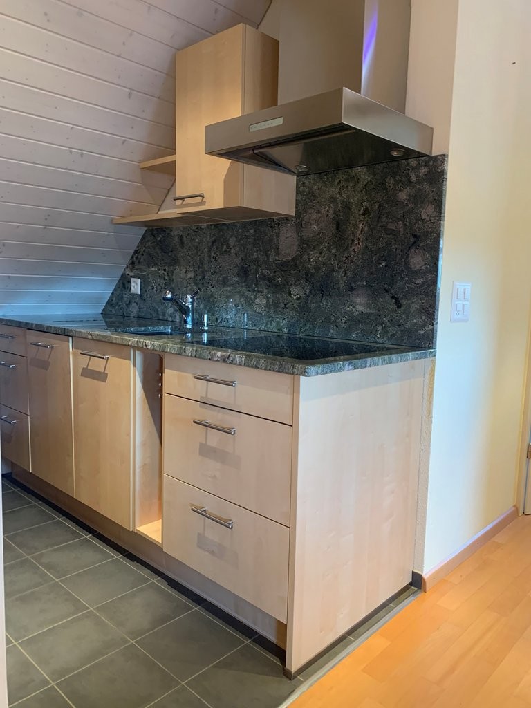 - Steinplatten in Küche und Bad, Parkettböden in den übrigen Räumen