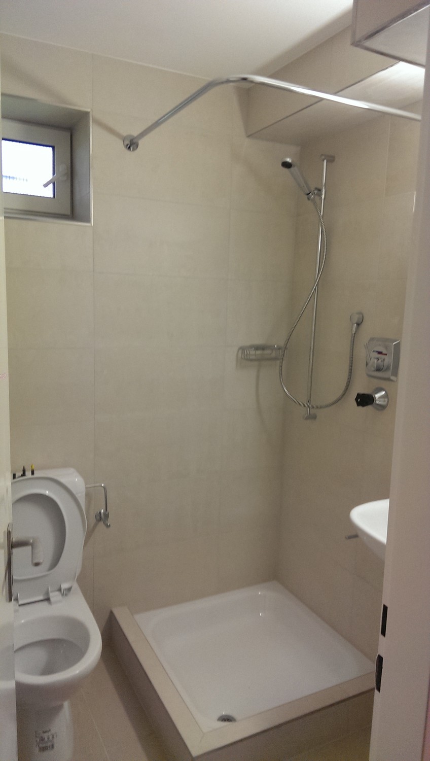 Die Einrichtung besteht aus einem neuen Bett, einem Tisch, einem TV und einem Kasten.