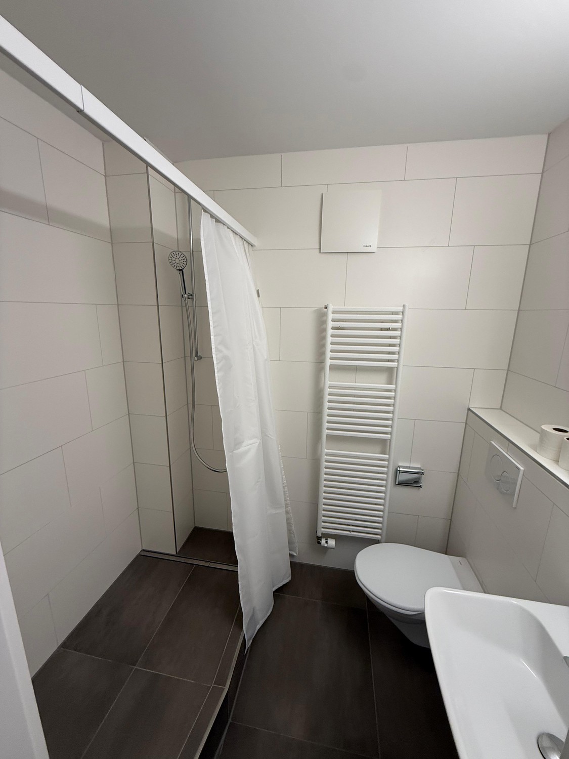 Neues Bad: Das Bad ist mit einer Dusche und modernen, grossen Fliesen ausgestattet
